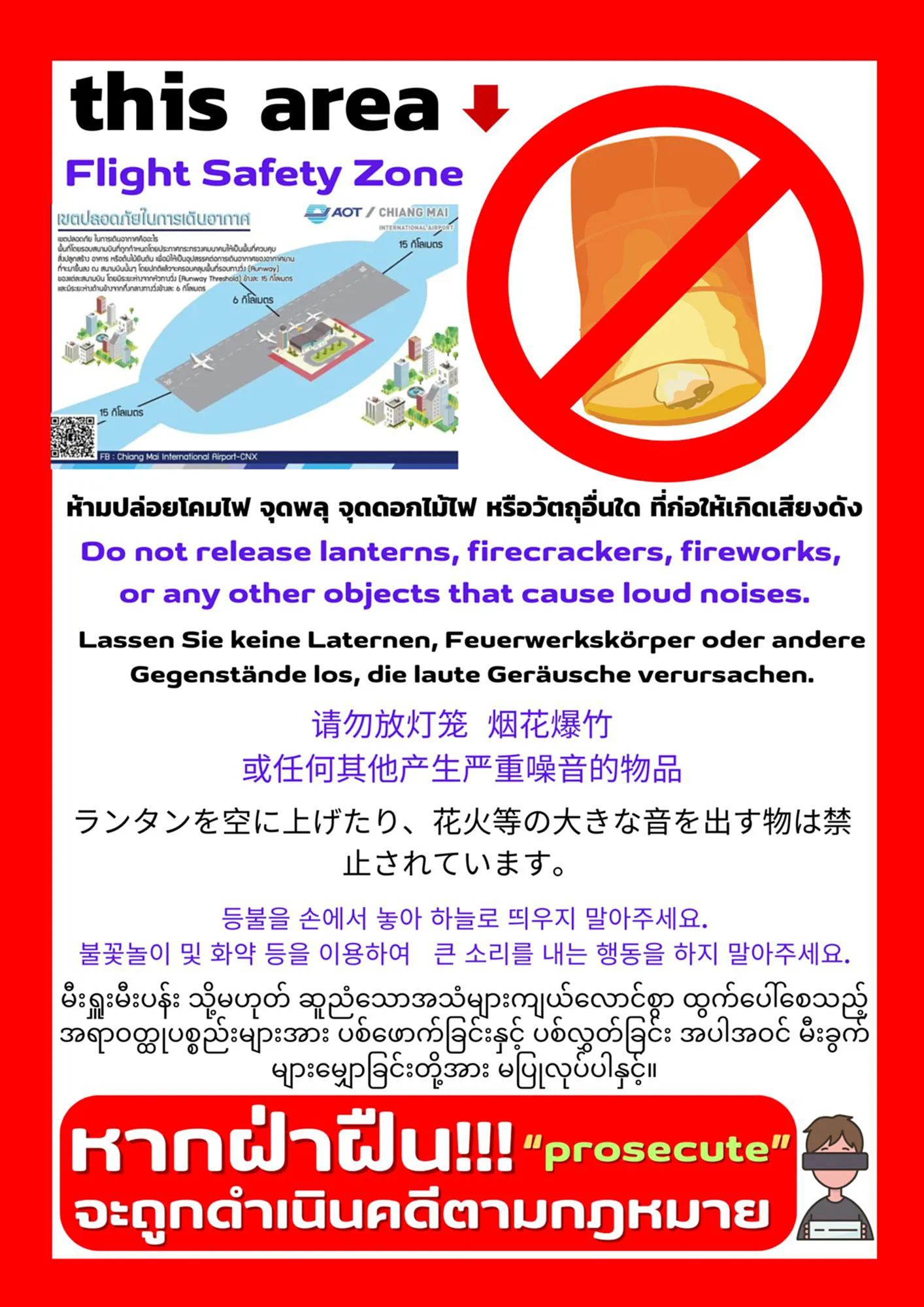 โดยจังหวัดเชียงใหม่ ได้กำหนดเขตพื้นที่ห้ามจุดและปล่อยโคมและพลุโดยเด็ดขาด เพื่อความปลอดภัยสูงสุดในชีวิตและทรัพย์สินของประชาชน ซึ่งจะอยู่ในเขตปลอดภัยในการเดินอากาศ (Toffy Zone) และพื้นที่เฝ้าระวังพิเศษระดับ 1 (Red Zone) ครอบคลุมพื้นที่ 6 อำเภอ 39 ตำบล ได้แก่ อ.เมืองเชียงใหม่ (ทุกตำบล) , อ.หางดง (ทุกตำบล) , อ.สารภี (ในพื้นที่ ต.ขัวมุง ต.ดอนแก้ว ต.สันทราย ต.ท่าวังตาล และ ต.หนองผึ้ง) , อ.สันทราย (พื้นที่ ต.หนองหาร) , อ.แม่ริม (พื้นที่ ต.ดอนแก้ว ต.เหมืองแก้ว ต.ริมใต้ ต.แม่สา ต.ริมเหนือ) และ อ.สันป่าตอง ในพื้นที่ ต.ทุ่งต้อม สำหรับผู้ที่ฝ่าฝืนจุดและปล่อยโคมและพลุโดยไม่ได้รับอนุญาต หรือปล่อยนอกพื้นที่ที่กำหนด จะต้องระวางโทษจำคุกไม่เกิน 5 ปี หรือปรับไม่เกิน 200,000 บาท หรือทั้งจำทั้งปรับ หากการกระทำดังกล่าวเป็นเหตุให้เกิดเพลิงไหม้ ต้องระวางโทษจำคุกไม่เกิน 7 ปี และปรับไม่เกิน 140,000 บาท