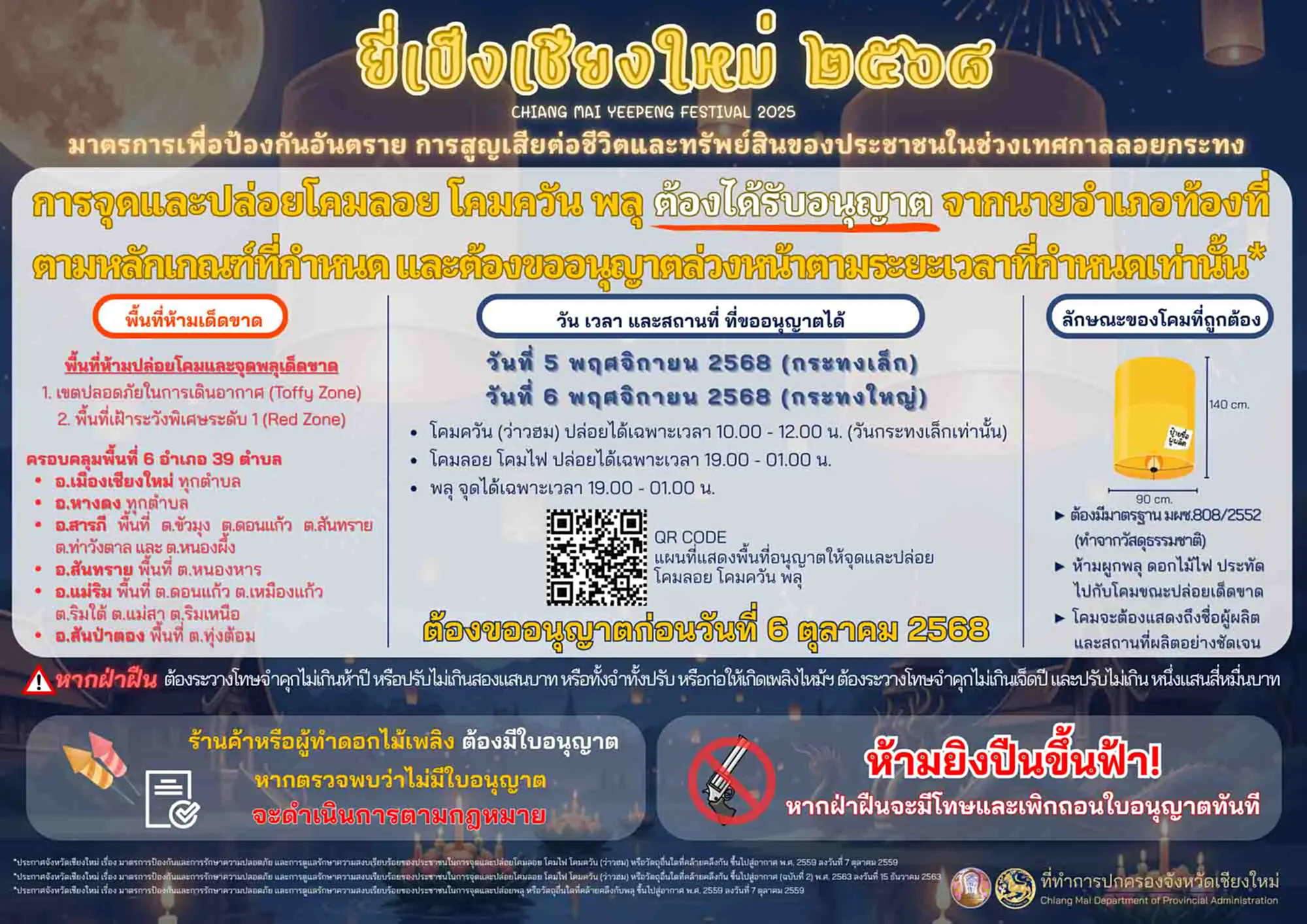 ทั้งนี้ จังหวัดเชียงใหม่มุ่งหวังให้การจัดงานประเพณียี่เป็ง 2568 เป็นไปด้วยความเรียบร้อย ปลอดภัย และคงไว้ซึ่งวัฒนธรรมอันดีงาม จึงขอความร่วมมือจากทุกภาคส่วนในการปฏิบัติตามมาตรการที่กำหนดอย่างเคร่งครัด หากมีข้อสงสัยเพิ่มเติม สามารถสอบถามได้ที่ ที่ทำการปกครองจังหวัดเชียงใหม่ กลุ่มงานปกครอง ฝ่ายการอนุญาตทางปกครอง หมายเลขโทรศัพท์ 0 5311 2639