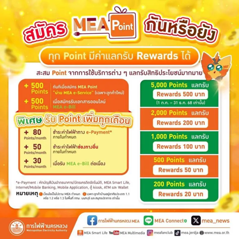 🔶 คุณจะได้รับ MEA Point จากการใช้บริการต่าง ๆ ของ MEA เช่น