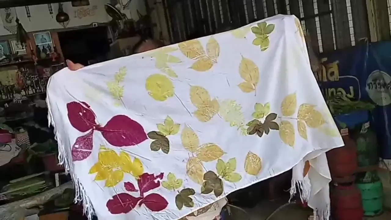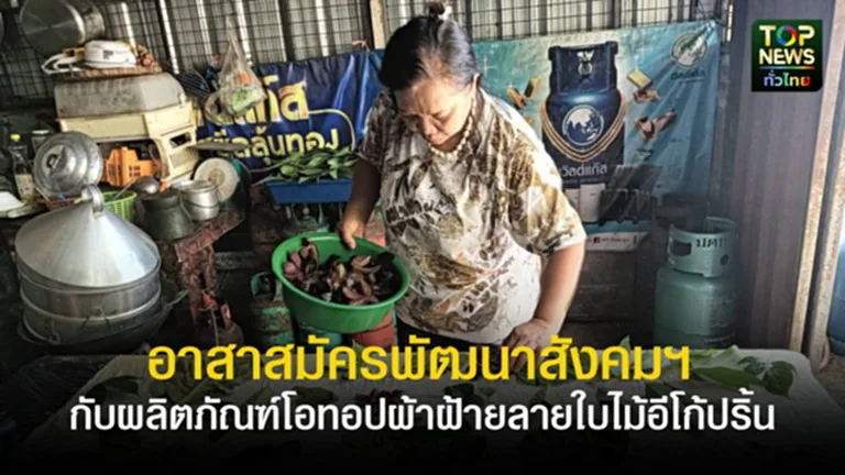 อาสาสมัครพัฒนาสังคมและความมั่นคงของมนุษย์กับผลิตภัณฑ์โอทอปผ้าฝ้ายลายใบไม้อีโก้ปริ้น(Ego Print)งานฝีมือโญแฮนด์เมด