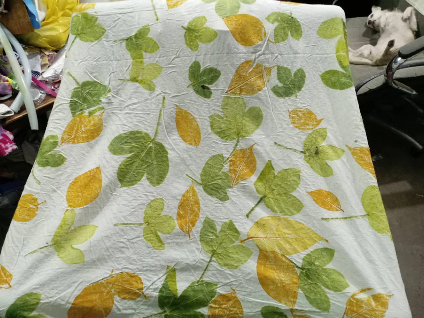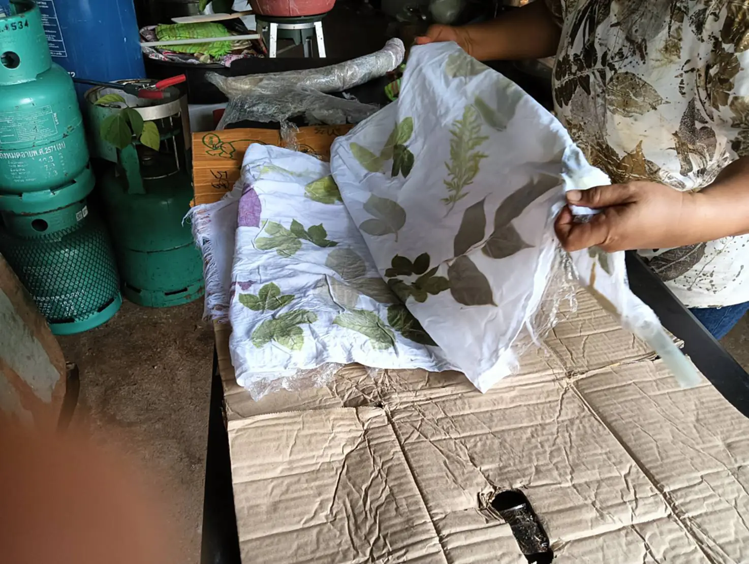 ต่อมาก็เป็นการเตรียมใบไม้แต่ละชนิดที่จะวางบนผืนผ้าซึ่งใบไม้เหล่านั้นจะต้องสดส่วนใหญ่ใบไม้ทุกชนิดจะอุดมสมบูรณ์ในช่วงหน้าฝนการให้สีก็จะโดดเด่น โดยจะพิมพ์ครั้งละ 2 หลาซึ่งก็จะทำมากกว่า 2 หลาก็ได้ แต่เนื่องจากโต๊ะที่จะวางผ้ายาวเพียง 2 หลาเท่านั้น ขั้นตอนถัดไปคือการนำผ้าที่แช่ไว้ในถังน้ำกัดสนิมมา โดยเอาพลาสติกปูวางบนพื้นโต๊ะและนำใบไม้หลากหลายชนิดที่เตรียมไว้ซึ่งก็จะต้องเป็นใบไม้ที่สดวางไปบนผืนผ้าให้เต็มนำผ้าส่วนที่เกินอยู่พับปิดทับลงไป จากนั้นให้นำพลาสติกปิดทับอีกครั้งและทำการม้วนจนสุดผืนผ้านำพลาสติกมาพันม้วนผาให้แน่นโดยไม่ให้มีน้ำซึมเข้าไปบนผืนผ้า หลังจากนั้นก็นำม้วนผ้าไปใส่ในหม้อนึ่งที่มีความร้อนสูง ทิ้งไว้ประมาณ 1.30-2 ชั่วโมง
