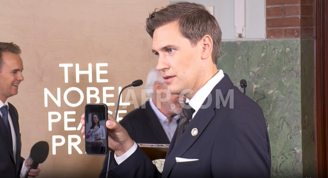 AFP และ BBC รายงานคณะกรรมการโนเบลที่กรุงออสโล ประเทศนอร์เวย์ได้ประกาศผู้ชนะรางวัลโนเบลสาขาสันติภาพเมื่อเวลา 1600 นาฬิกาที่ผ่านมาตามเวลาไทย (ศุกร์ที่ 10 ตค.) ประกาศว่าผู้ที่คว้ารางวัลเกียรติยศนี้ไปครองคือมาเรีย โครีน่า มาชาโด ผู้นำฝ่ายค้านและนักเคลื่อนไหวเพื่อประชาธิปไตยชาวเวเนซูเอล่าวัย 58 ปี