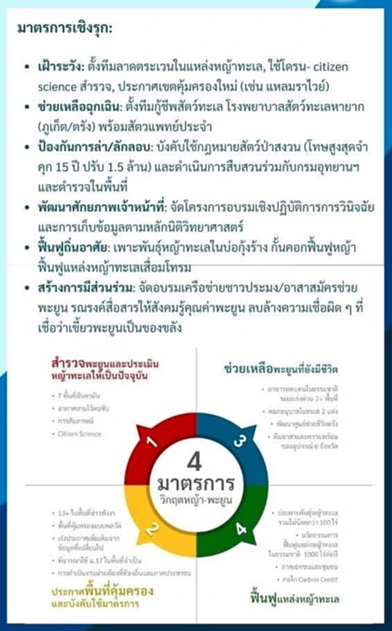 ดร.ปิ่นสักก์ สุรัสวดี อธิบดีกรมทรัพยากรทางทะเลและชายฝั่ง กล่าวว่า กรมฯ ได้หารือร่วมกับกองบังคับการปราบปรามการกระทำผิดเกี่ยวกับทรัพยากรธรรมชาติและสิ่งแวดล้อม (บก.ปทส.) เกี่ยวกับแผนงานโครงการในการป้องกันปราบปรามการตัดเขี้ยวพะยูน พร้อมดำเนินการในมาตรการเชิงรุกแบบบูรณาการ ทั้งภาครัฐ เอกชน และชุมชน ผ่านแนวทางสำคัญ ได้แก่ การเฝ้าระวังและป้องกัน จัดตั้งทีมลาดตระเวนในแหล่งหญ้าทะเล ใช้เทคโนโลยีโดรนและระบบ citizen science ในการติดตามพะยูน และพิจารณาประกาศเขตคุ้มครองใหม่ การช่วยเหลือฉุกเฉิน โดยตั้งทีมกู้ชีพสัตว์ทะเล พร้อมสัตวแพทย์ประจำในโรงพยาบาลสัตว์ทะเลหายาก (ภูเก็ต/ตรัง) การป้องกันการล่า และลักลอบ ดำเนินการสืบสวนร่วมกับกรมอุทยานฯ และตำรวจในพื้นที่ โดยบังคับใช้กฎหมายตามพระราชบัญญัติสงวนและคุ้มครองสัตว์ป่า พ.ศ. 2562 ซึ่งกำหนดโทษสูงสุดจำคุก 15 ปี หรือปรับ 1.5 ล้านบาท นอกจากนี้ ยังได้พัฒนาศักยภาพเจ้าหน้าที่ในการจัดโครงการอบรมเชิงปฏิบัติการการวินิจฉัยและการเก็บข้อมูลตามหลักนิติวิทยาศาสตร์ รวมถึงการฟื้นฟูถิ่นอาศัย เพาะพันธุ์หญ้าทะเลในบ่อกุ้งร้าง กั้นคอกฟื้นฟูหญ้า ฟื้นฟูแหล่งหญ้าทะเลเสื่อมโทรม และสร้างการมีส่วนร่วม จัดอบรมเครือข่ายชาวประมง อาสาสมัครช่วยพะยูน พร้อมรณรงค์สื่อสารให้สังคมรู้คุณค่าของพะยูน ลบล้างความเชื่อผิด ๆ ที่เชื่อว่า “เขี้ยวพะยูนเป็นของขลัง”