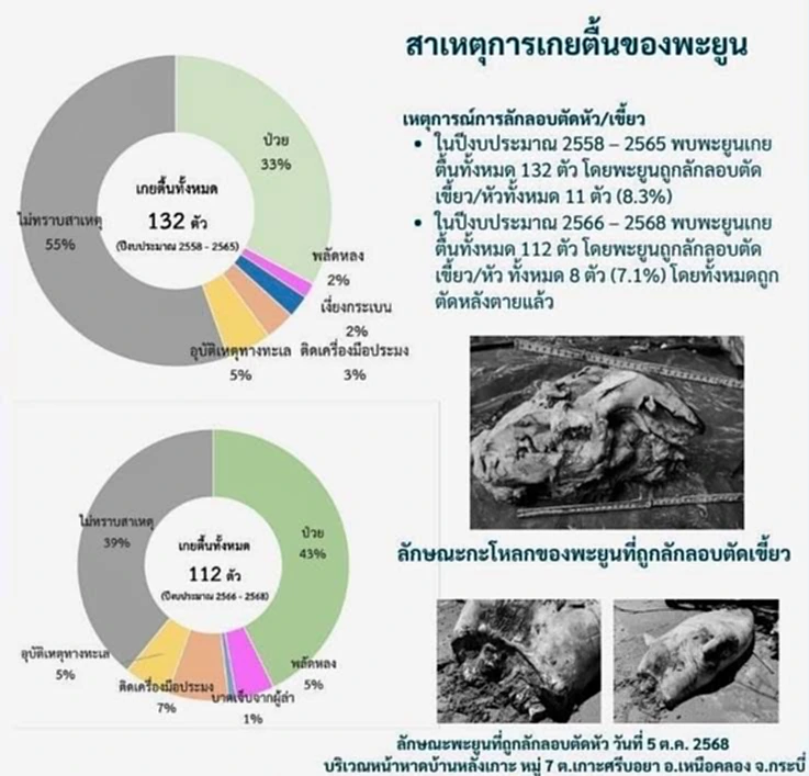 วันที่ 10 ตุลาคม 2568 นายสุชาติ ชมกลิ่น รองนายกรัฐมนตรีและรัฐมนตรีว่าการกระทรวงทรัพยากรธรรมชาติและสิ่งแวดล้อม เปิดเผยถึงแผนรับมือพะยูนตายและการล่าเอาเขี้ยวพะยูนในปัจจุบัน เนื่องจากสถานการณ์ล่าสุด ในวันที่ 5 ตุลาคม 2568 พบพะยูนถูกตัดหัว บริเวณหน้าหาดบ้านหลังเกาะ หมู่ 7 ตำบลเกาะศรีบอยา อำเภอเหนือคลอง จังหวัดกระบี่ และจากสถานการณ์การเกยตื้นของพะยูน ในปีงบประมาณ 2566 – 2568 พบพะยูนเกยตื้นทั้งหมด 112 ตัว เป็นพะยูนที่ถูกลักลอบตัดเขี้ยว/หัว จำนวน 8 ตัว และข้อมูลในปีงบประมาณ 2569 พบพะยูนเกยตื้นทั้งหมด 2 ตัว เป็นพะยูนที่ถูกลักลอบตัดเขี้ยว/หัว จำนวน 1 ตัว โดยทั้งหมดถูกตัดหลังตายแล้ว จึงได้สั่งการให้กรมทรัพยากรทางทะเลและชายฝั่งและหน่วยงานที่เกี่ยวข้อง ดำเนินการสืบสวนหาผู้กระทำผิดอย่างเร่งด่วน เน้นย้ำ “ไม่ใช่แค่นับศพ แต่ต้องเปลี่ยนเป็นรักษาชีวิต” กำชับเจ้าหน้าที่ในพื้นที่ให้เพิ่มความเข้มงวดในการเฝ้าระวัง เพื่อป้องกันไม่ให้เกิดเหตุซ้ำอีก