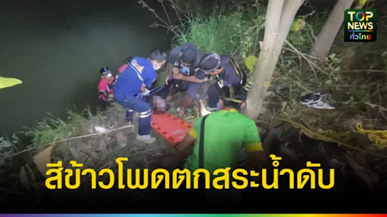 สลด ! หนุ่มใหญ่กลับจากสีข้าวโพด รถจักรยานยนต์เสียหลักชนต้นไม้ตกสระน้ำดับคาที่