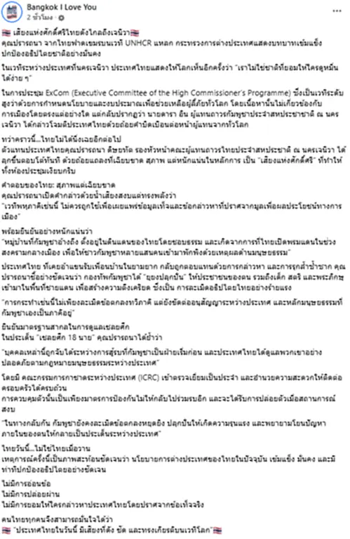 11 ต.ค. 68 เพจเฟซบุ๊ก Bangkok I Love You ได้โพสต์ภาพและข้อความระบุว่า “เสียงแห่งศักดิ์ศรีไทยดังไกลถึงเจนีวา คุณปรารถนา จากไทยฟาดเขมรบนเวที UNHCR แหลก กระทรวงการต่างประเทศแสดงบทบาทเข้มแข็ง ปกป้องอธิปไตยชาติอย่างมั่นคง ในเวทีระหว่างประเทศที่นครเจนีวา ประเทศไทยแสดงให้โลกเห็นอีกครั้งว่า “เราไม่ใช่ชาติที่ยอมให้ใครดูหมิ่นได้ง่าย ๆ”