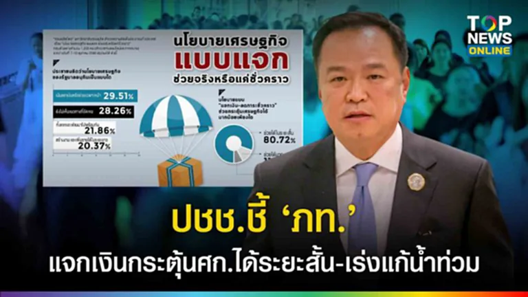 เมื่อวันที่ 12 ตุลาคม 2568 “สวนดุสิตโพล” มหาวิทยาลัยสวนดุสิต สำรวจความคิดเห็นประชาชนทั่วประเทศ เรื่อง “นโยบายเศรษฐกิจแบบแจก ช่วยจริงหรือแค่ชั่วคราว” กลุ่มตัวอย่าง จำนวน 1,203 คน ระหว่างวันที่ 7-10 ตุลาคม 2568 พบว่า กลุ่มตัวอย่าง ร้อยละ 29.51 มองว่านโยบายเศรษฐกิจของรัฐบาลอนุทิน เป็นแบบเน้นแจกเงินหรือช่วยเฉพาะหน้า และร้อยละ 28.26 ชี้ว่ายังไม่เห็นแนวทางที่ชัดเจน