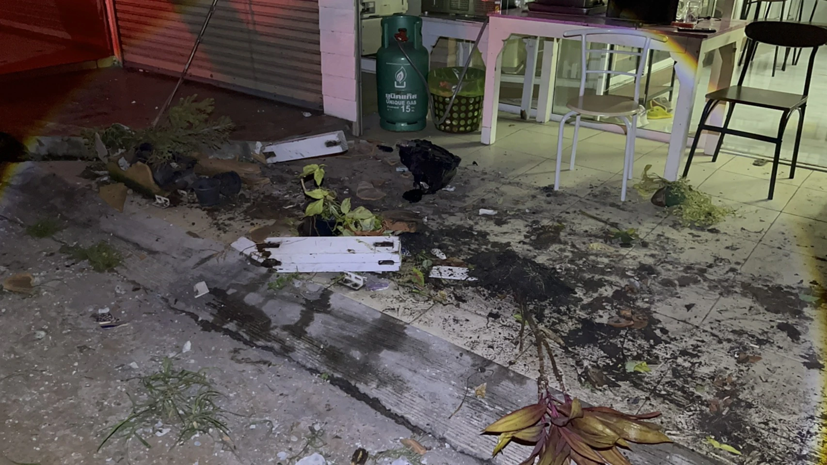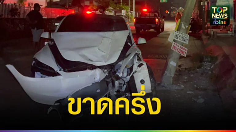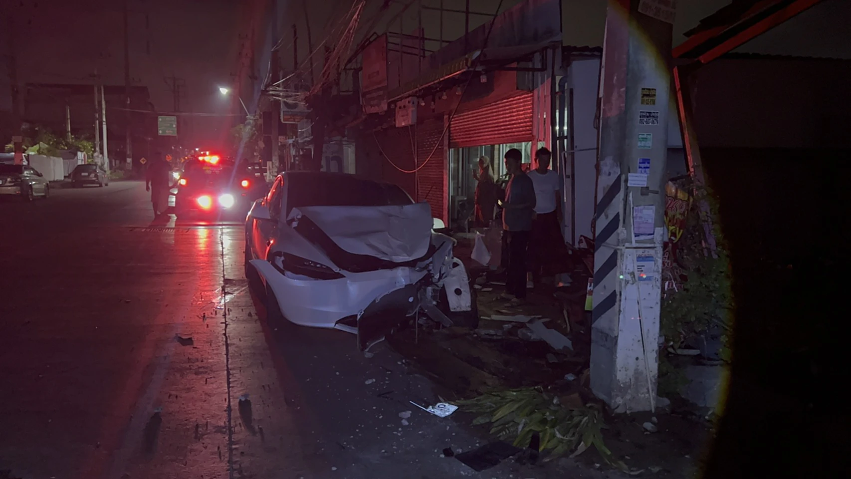 ที่เกิดเหตุพบรถยนต์เก๋งไฟฟ้า ยี่ห้อ เทสลา สีขาว สภาพด้านหน้าพังยับเยิน ห่างออกไปเล็กน้อยพบรถยนต์เก๋ง ฮอนด้า ซีวิค สีบรอนซ์ ที่จอดอยู่ริมทาง ถูกชนท้ายได้รับความเสียหาย นอกจากนี้รถคันต้นเหตุยังไถลไปชน เสาไฟฟ้าริมทางจนหักขาดครึ่ง ก่อนหมุนไปกระแทกเข้าร้านขายแฮมเบอร์เกอร์ข้างทาง ทำให้ป้ายร้าน โต๊ะ เก้าอี้ และข้าวของภายในร้านได้รับความเสียหาย