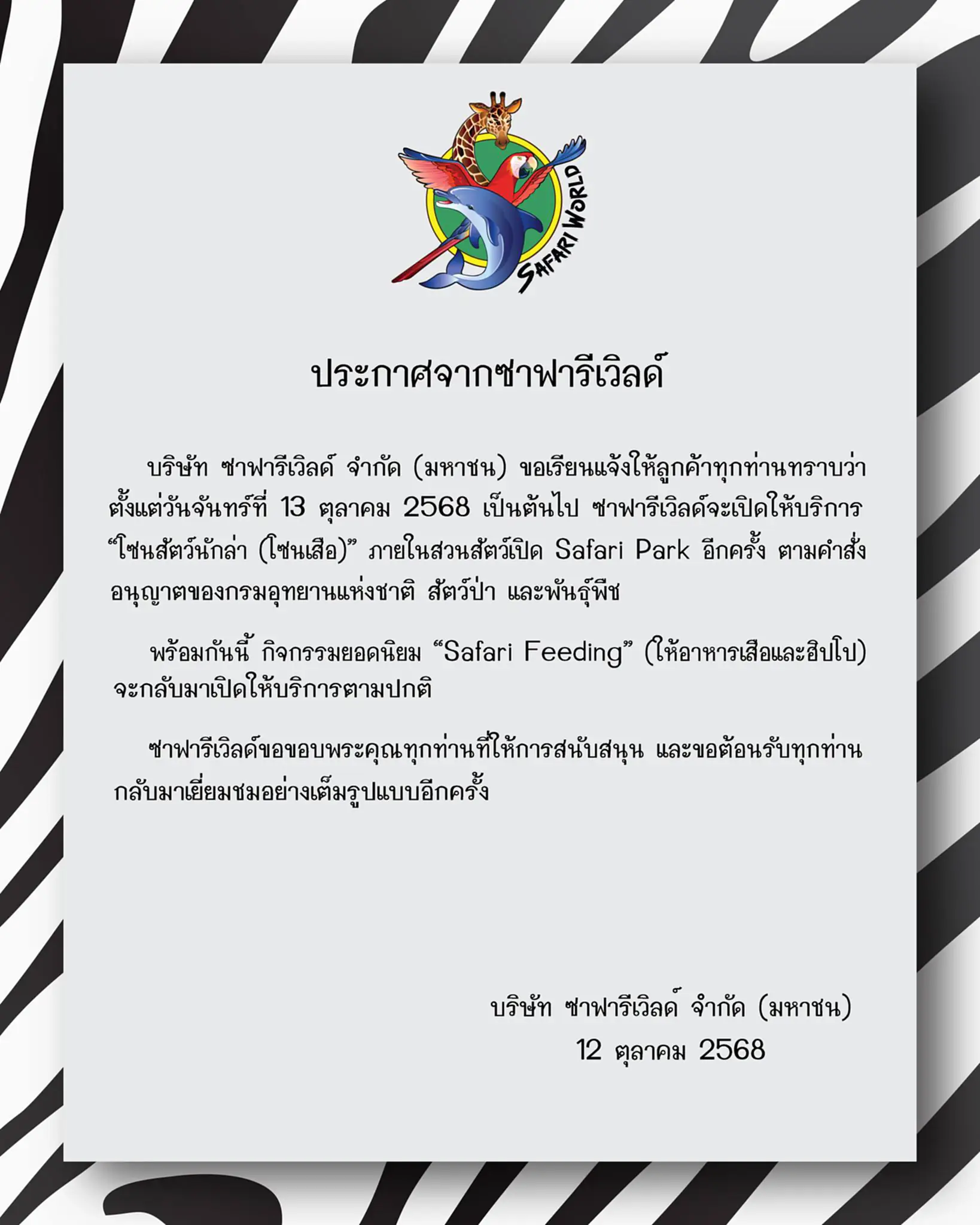 เมื่อวันที่ 12 ตุลาคม 2568 แฟนเพจ “Safari World” ได้ออกมาประกาศเปิดให้บริการ “โซนสัตว์นักล่า (โซนเสือ)” ภายใน Safari Park อีกครั้ง ตามอนุญาตจากกรมอุทยานฯ พร้อมคืนกิจกรรมยอดนิยม Safari Feeding ให้อาหารเสือและฮิปโปฯ เริ่ม 13 ตุลาคม 2568 เป็นต้นไป
