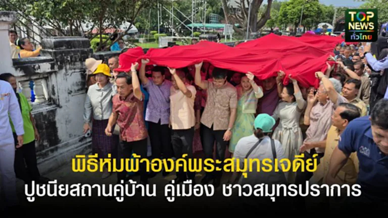 เมื่อเวลา 14.30 น.วันที่ 12 ต.ค.68 นาย สยาม ศิริมงคล ผู้ว่าราชการจังหวัดสมุทรปราการ เป็นประธานอัญเชิญผ้าแดงห่มองค์พระสมุทรเจดีย์ ทำพิธีทักษิณาวรรต รอบองค์พระสมุทรเจดีย์ 3 รอบ เพื่อสักการะพระบรมสารีริกธาตุ 12 องค์ ขององค์สมเด็จพระสัมมาสัมพุทธเจ้า ซึ่งบรรจุอยู่ภายในองค์พระสมุทรเจดีย์ ก่อนที่จะส่งมอบให้กับผู้ประกอบพิธีห่มผ้าองค์พระสมุทรเจดีย์ ซึ่งเป็นสมาชิกในตระกูลรุ่งแจ้ง นำขึ้นไปห่มบนคอระฆังขององค์พระสมุทรเจดีย์ โดยมีหัวหน้าส่วนราชการ ทั้งภาครัฐ ภาคเอกชนและประชาชน ร่วมกันประกอบพิธีห่มผ้าองค์พระสมุทรเจดีย์ สำหรับพิธีดังกล่าวจะจัดขึ้นเป็นประจำทุกปี ในวันแรม 5 ค่ำ เดือน 11 ซึ่งปีนี้ตรงกับวันที่ 12 ต.ค.68