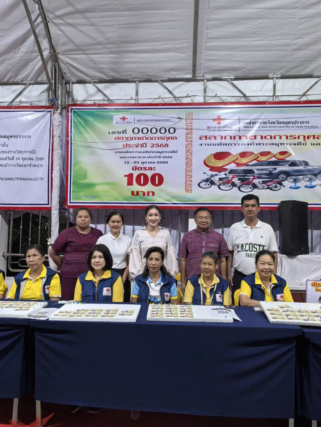 นางอรจิรา ศิริมงคล นายกเหล่ากาชาดจังหวัดสมุทรปราการ เผยว่าในปีนี้ ผู้ที่ทำบุญซื้อสลากการชาด ลุ้นรับของรางวัลใหญ่มากมาย ทั้งรถกระบะ , รถจักรยานยนต์ และอื่นๆ อีกมากมาย จึงอยากจะเชิญชวนประชาชนชาวสมุทรปราการ รวมถึงนักท่องเที่ยว ที่เดินทางมาเที่ยวงาน ร่วมทำบุญซื้อสลากกาชาด ปีนี้ย้ายจากหน้าศาลากลางจังหวัดฯ มาบริเวณหน้าที่สำนักงานกาชาดจังหวัดสมุทรปราการ (ซอยตรงข้ามโรงพัก สภ.เมืองสมุทรปราการ) ตั้งแต่เวลา 09.00 – 23.00 น. เพราะ”เราช่วยกาชาด กาชาดช่วยเรา”