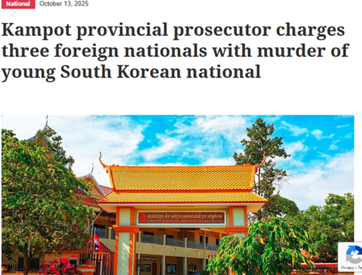 เช้าวันนี้ (13 ตค.) AKP สื่อกัมพูชารายงานความคืบหน้าคดีนักศึกษาเกาหลีใต้วัย 22 ปีถูกพบเป็นศพที่หมู่บ้านอ่าวกำปงเหนือ จังหวัดกำปอด ประเทศกัมพูชาเมื่อวันที่ 8 สิงหาคม 2568 ที่ผ่านมาว่า ล่าสุดสำนักงานอัยการจังหวัดกำปอดได้ตั้งข้อหาฆาตกรรม, กระทำการรุนแรงและมีส่วนร่วมกับการหลอกลวงออนไลน์กับชาวจีนจำนวน 3 และผู้สมรู้ร่วมคิด