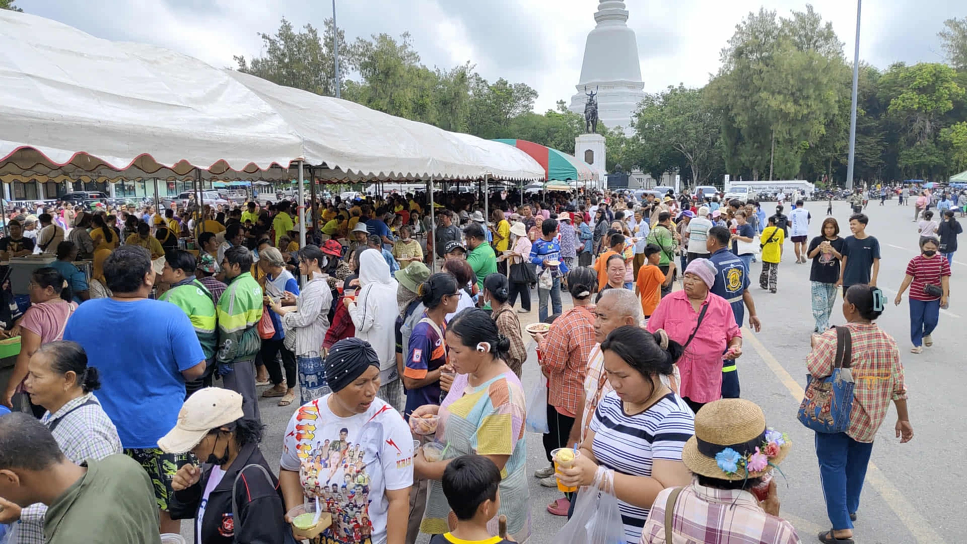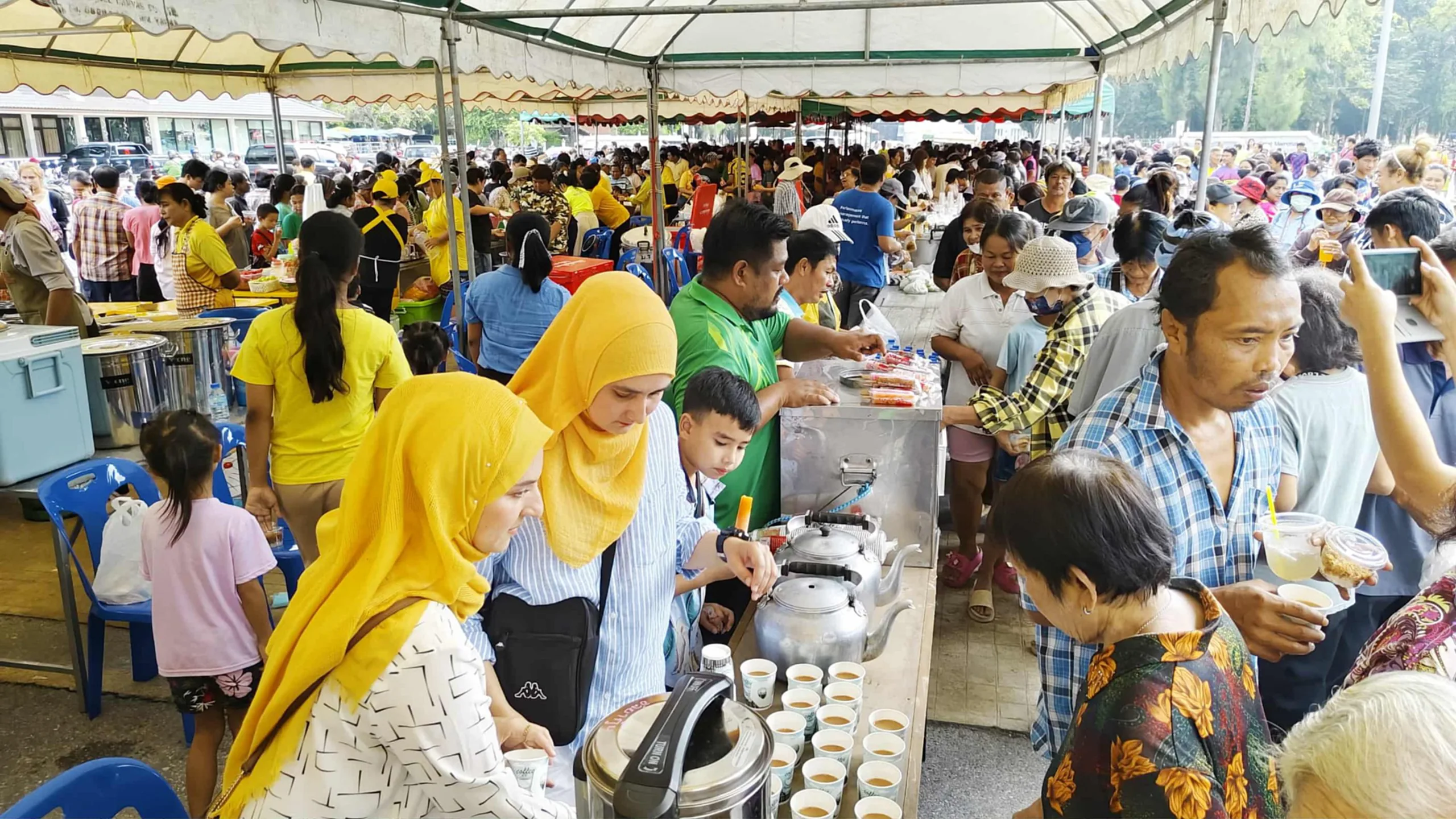 โดยนายสกนธ์ บุญศรีสุวรรณ นายกเทศมนตรีตำบลดอนเจดีย์ ได้จัดตั้งเต็นท์ บริการให้พสกนิกรกลุ่มรักบ้านเกิด กลุ่มพันธมิตร จิตอาสา ผู้ประกอบการร้านค้า นำอาหาร คาวหวาน น้ำดื่ม มาบริการให้ประชาชนชาวอำเภอดอนเจดีย์และประชาชนที่เดินทางมาสักการะพระบรมราชานุสาวรีย์ องค์สมเด็จพระนเรศวรมหาราช ได้รับประทาน นอกจากนี้ พระครูพิทักษ์ศาสนวงศ์ (หลวงพ่อไก่) ได้มอบหมายให้ คณะสงฆ์ แม่ชี วัดตรีวิสุทธิธรรม นำข้าวสาร บรรจุถุงละ 5 กิโลกรัมน้ำตาลทรายขาว ถุงละ 1 กิโล อย่างละ 500 ถุงมามอบให้กับประชาชนเพื่อเป็นการช่วยบรรเทาความเดือดร้อนของประชาชน และร้านเสริมสวยฝนพื้นที่ อำเภอดอนเจดีย์ ได้พร้อมใจกันมาออกร้านตัดผมฟรีให้ประชาชนทั้งชายหญิง