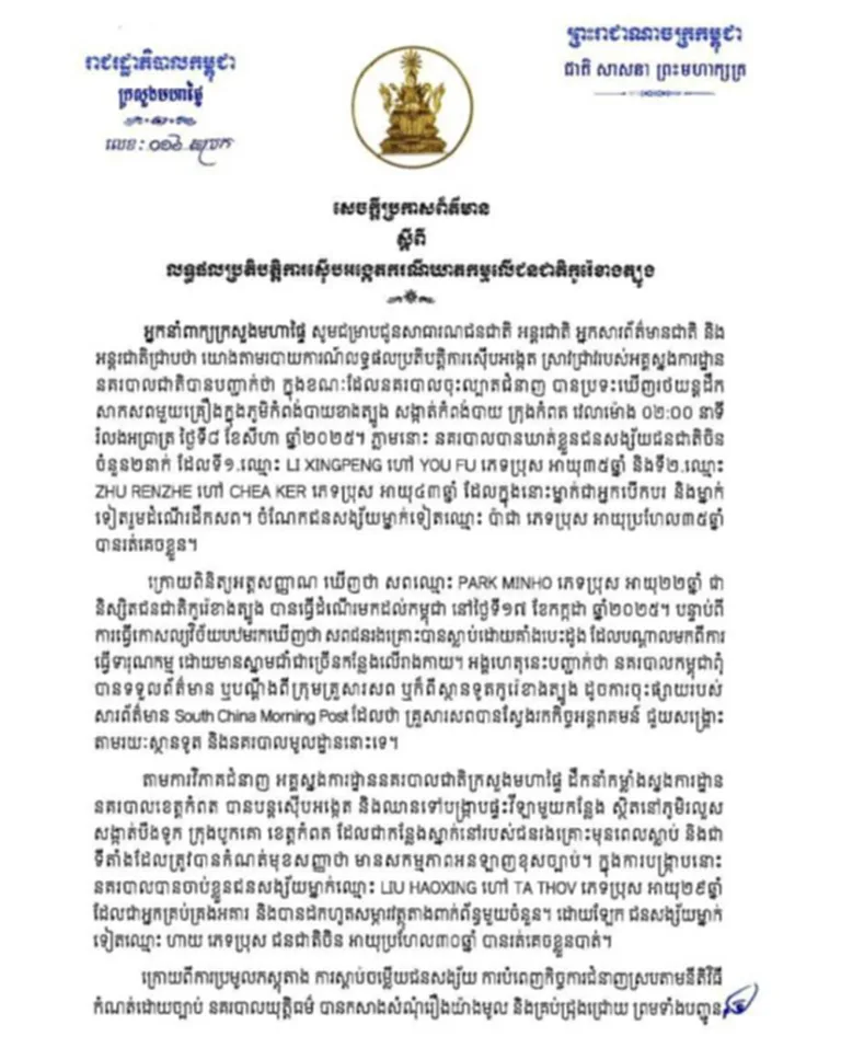 14 ตุลาคม 2568 กระทรวงมหาดไทย กัมพูชา ออกแถลงชี้แจงผลการสืบสวนคดีฆาตกรรมพลเมืองเกาหลีใต้