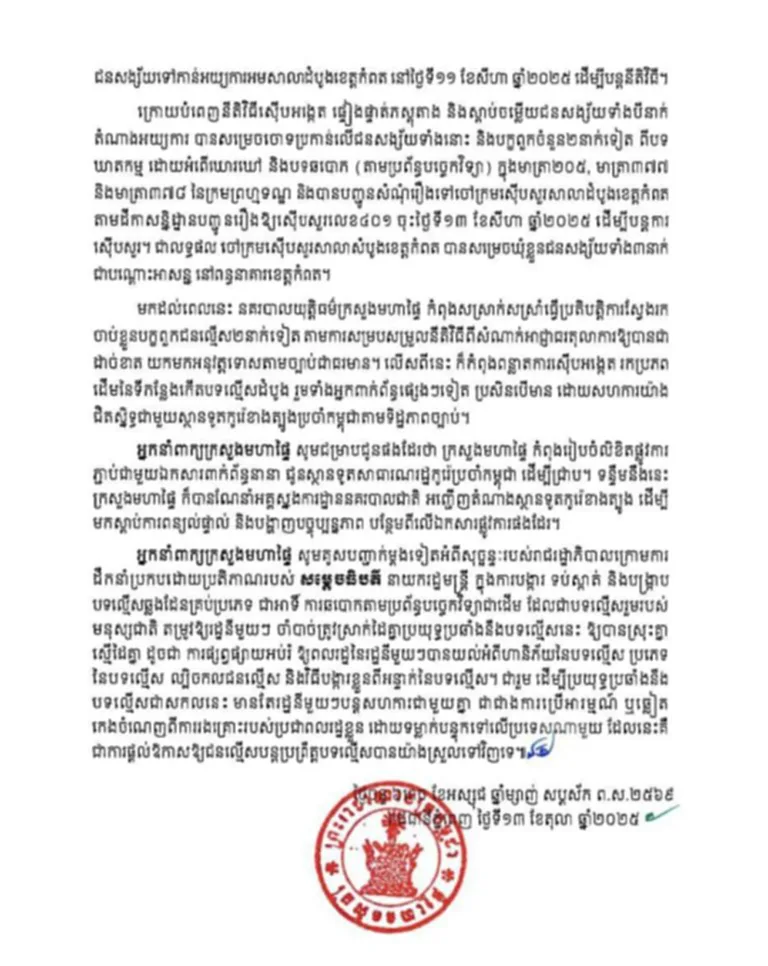 โฆษกกระทรวงมหาดไทยแจ้งว่า กระทรวงมหาดไทยกำลังจัดทำหนังสืออย่างเป็นทางการพร้อมเอกสารที่เกี่ยวข้องไปยังสถานเอกอัครราชทูตสาธารณรัฐเกาหลีประจำกัมพูชาเพื่อแจ้งให้ทราบ ขณะเดียวกันกระทรวงมหาดไทยยังได้สั่งการให้ผู้บัญชาการตำรวจแห่งชาติเชิญผู้แทนจากสถานทูตเกาหลีใต้มารับฟังคำชี้แจงด้วยตนเอง และให้ข้อมูลอัปเดตเพิ่มเติมจากเอกสารอย่างเป็นทางการ