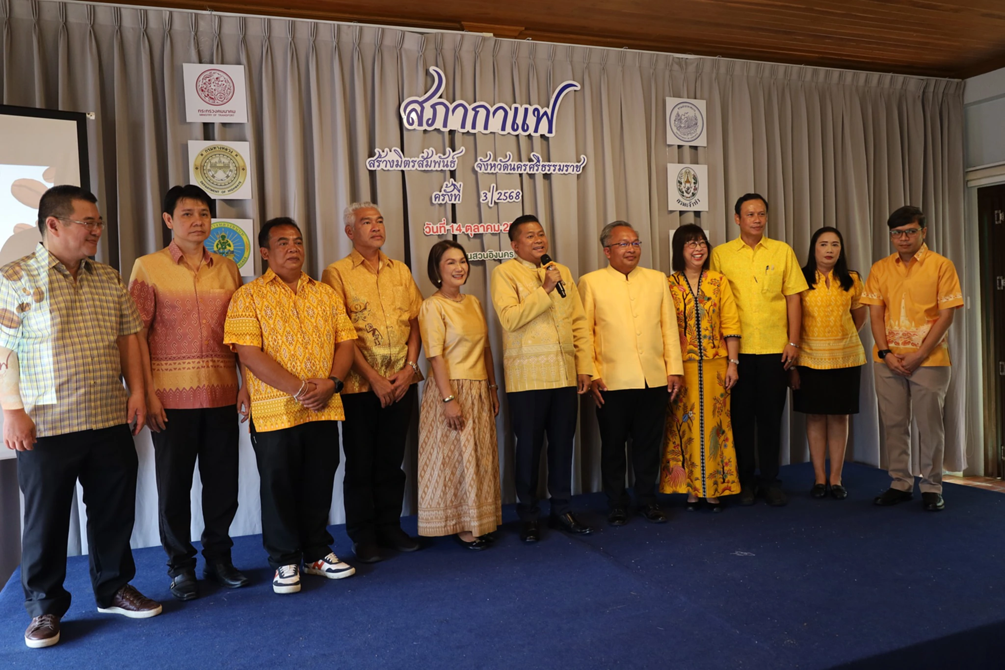 วันที่ 14 ต.ค. 2568 ผู้สื่อข่าวรายงานว่า นายสมชาย ลีหล้าน้อย ผู้ว่าราชการจังหวัดนครศรีธรรมราช เป็นประธานกิจกรรม “สภากาแฟ สร้างมิตรสัมพันธ์” จังหวัดนครศรีธรรมราช ครั้งที่ 3/68 จัดขึ้น ณ บ้านสวนอิงนคร ตำบลโพธิ์เสด็จ อำเภอเมืองฯ โดยมีหัวหน้าส่วนราชการ เหล่ากาชาดจังหวัด ภาคเอกชน และเครือข่ายภาคส่วนต่าง ๆ เข้าร่วมอย่างคับคั่ง ภายใต้บรรยากาศเป็นกันเอง เพื่อแลกเปลี่ยนมุมมองการพัฒนา และร่วมพูดคุยแนวทางแก้ไขปัญหาของพื้นที่ในรูปแบบไม่เป็นทางการ เสริมสร้างความสัมพันธ์ระหว่างภาครัฐและเอกชนให้แน่นแฟ้นยิ่งขึ้น