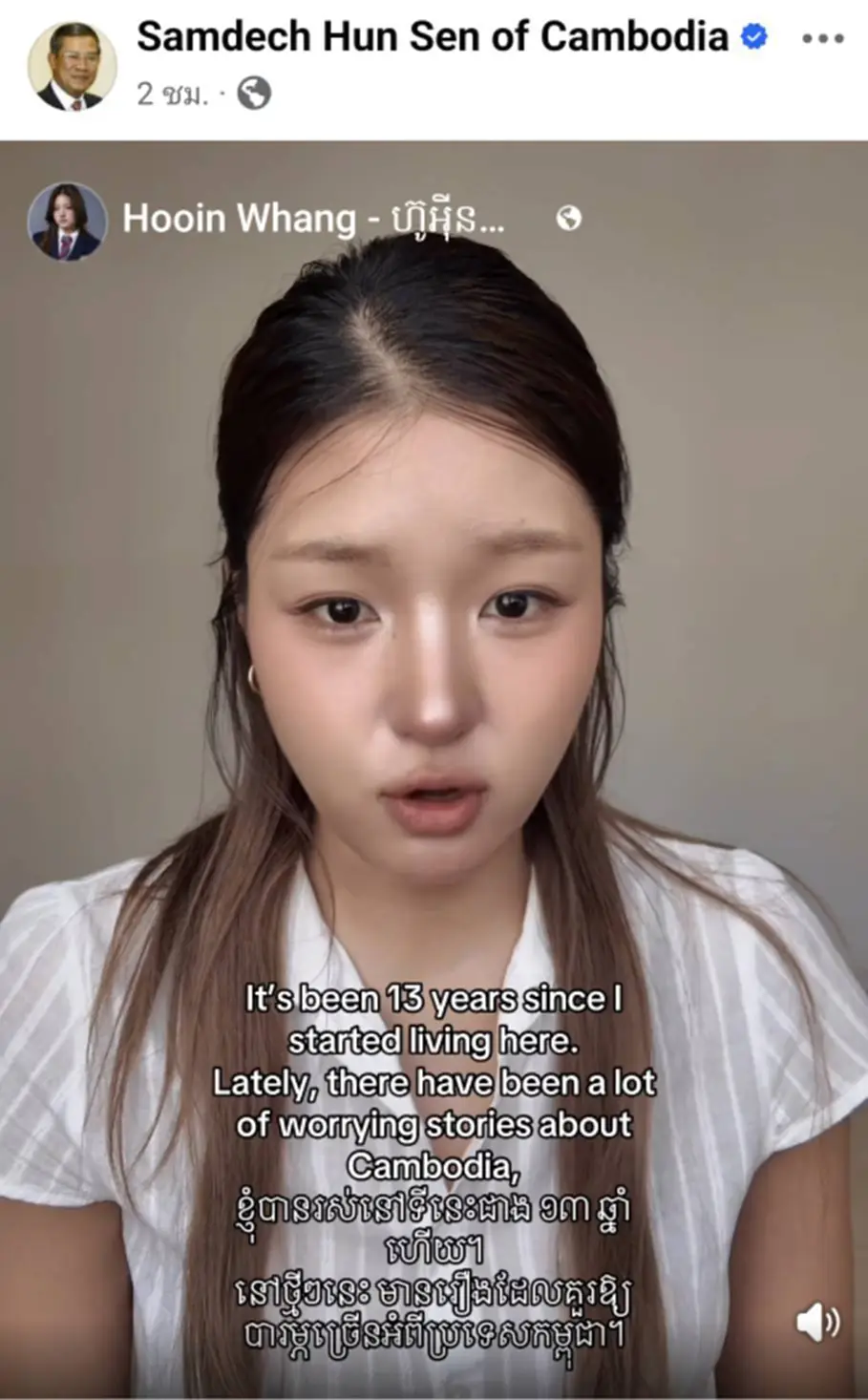 ทางด้าน สมเด็จฮุน เซน ประธานวุฒิสภากัมพูชาใช้เฟซบุ๊กแชร์คลิปวิดีโอของผู้ใช้เฟสบุ๊กชื่อ ฮูอิน วาง ซึ่งเป็นเจ้าของร้าน “คาเฟ่ Honest” ในกรุงพนมเปญ กัมพูชา โดยฮูอินกล่าวว่า ตนเองอยู่ที่นี่มาสามปีแล้ว ซึ่งช่วงหลังๆมามีเรื่องน่ากังวลเกี่ยวกับกัมพูชาเยอะมาก แต่ที่ตนเห็นและใช้ชีวิตอยู่ที่นี่ทุกวัน รู้สึกแตกต่างอย่างมากจากสิ่งที่เห็นในข่าว ชาวกัมพูชาที่นี่มีจิตใจบริสุทธิ์และมีน้ำใจ พวกเขายิ้มให้แม้แต่คนแปลกหน้า และพวกเขาก็ช่วยเหลือกันอย่างเล็กๆน้อยๆเสมอด้วยความมีน้ำใจ