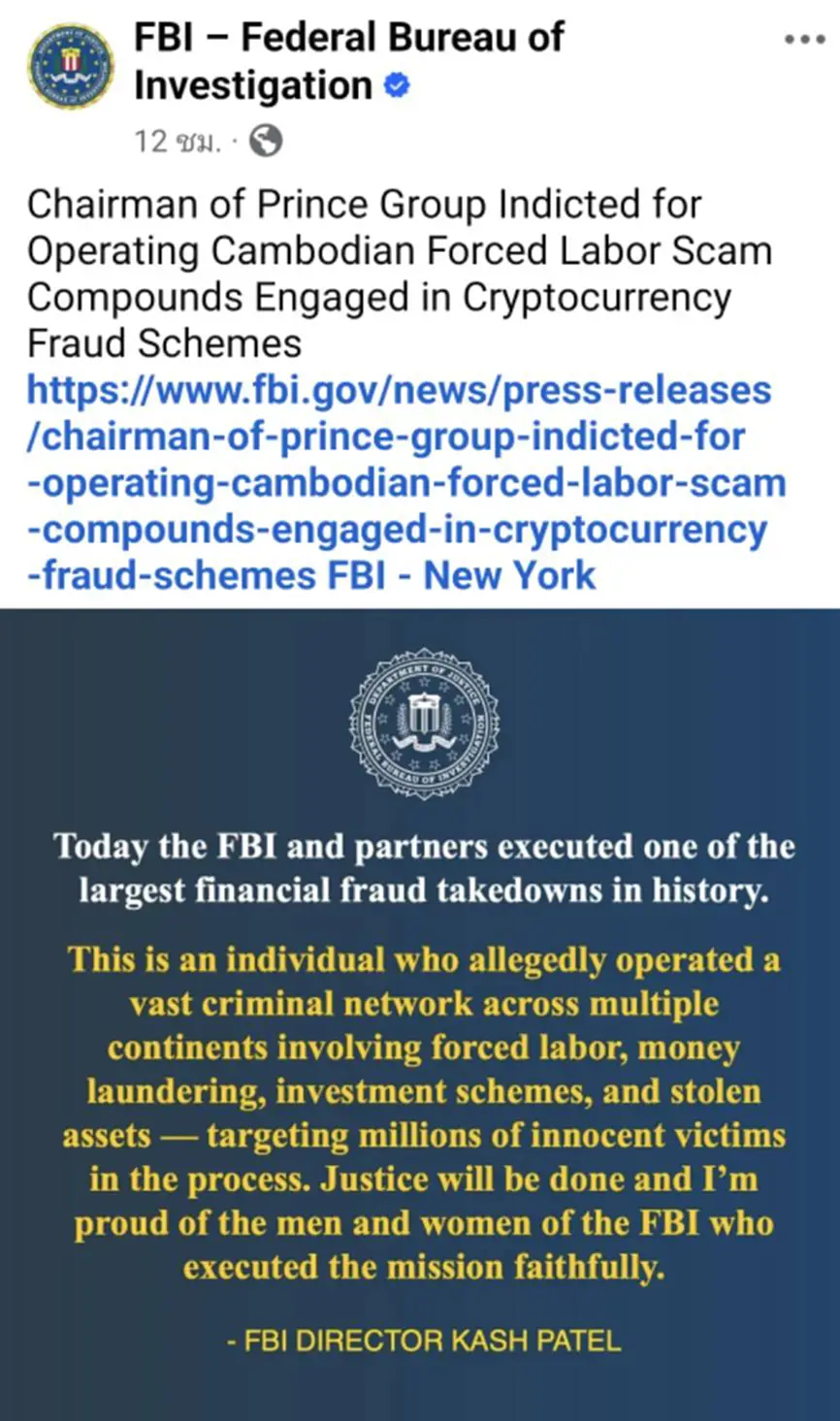 เพจเฟสบุ๊ก สำนักงานสอบสวนกลาง สหรัฐ หรือ FBI ได้โพสต์ความเห็นของ แคช ปาเทล ผู้อํานวยการFBI ที่กล่างถึงคดีนายเฉิน จื้อ ประธานบริษัท ปรินซ์ โฮลดิ้ง กรุ๊ป หรือ Prince Group ค้ามนุษย์บังคับแรงงานฉ้อโกงสกุลเงินดิจิทัล