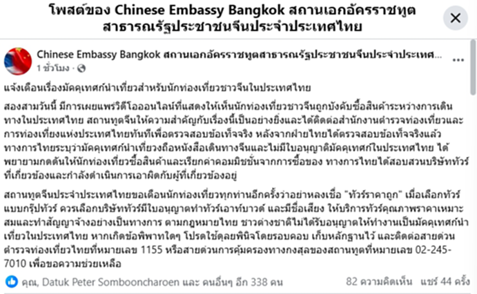 วันพุธที่ 15 ตุลาคม สถานทูตจีนประจำประเทศไทยโพสต์ข้อความผ่านเว็ปเพจระบุว่า ในช่วงไม่กี่วันที่ผ่านมา ได้มีการเผยแพร่วิดีโอออนไลน์ที่แสดงให้เห็นนักท่องเที่ยวชาวจีนถูกบังคับซื้อสินค้าระหว่างการเดินทางในประเทศไทย สถานทูตจีนให้ความสำคัญกับเรื่องนี้เป็นอย่างยิ่งและได้ติดต่อสำนักงานตำรวจท่องเที่ยวและการท่องเที่ยงแห่งประเทศไทยทันทีเพื่อตรวจสอบข้อเท็จจริง