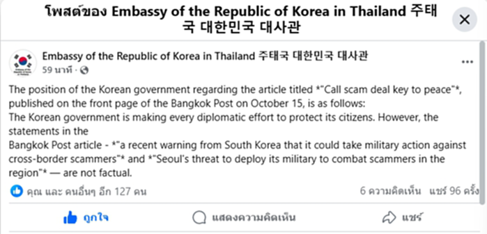 วันพุธที่ 15 ตุลาคม สถานเอกอัครราชทูตเกาหลีใต้ประจำกรุงเทพโพสต์ข้อความชี้แจงผ่านเว็ปเพจกรณีสื่อไทยบางแห่งรายงานข่าวว่า ”เกาหลีใต้ส่งสัญญานเตือนว่าอาจใช้ปฏิบัติการทางทหารปราบปรามแก๊งสแกมเมอร์หรืออาชญากรรมข้ามพรมแดนในกัมพูชา” และว่า “เกาหลีใต้ขู่จะส่งทหารเข้าไปเปิดปฏิบัติการสู้รบกับสมาชิกแก๊งสแกมเมอร์” ทั้งนี้ทางสถานทูตออกมาปฏิเสธ และยืนยันว่าไม่เป็นความจริง