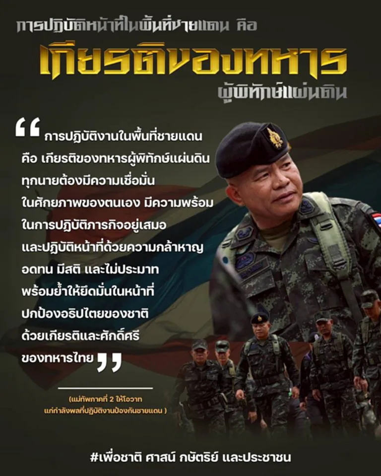 โดยแม่ทัพภาคที่ 2 ได้กล่าวแสดงความชื่นชมในความกล้าหาญ ความมุ่งมั่น และความเสียสละของกำลังพลทุกนาย ที่ปฏิบัติหน้าที่เพื่อปกป้องอธิปโตยของชาติ ตอนหนึ่งว่า “ทหารทุกนายปฏิบัติหน้าที่ด้วยความกล้าหาญ เสียสละ และยึดมั่นในเกียรติและศักดิ์ศรีในความเป็นทหารอาชีพ ขอให้เชื่อมั่นในภารกิจที่รับผิดชอบ ว่าทุกสิ่งที่ทำ เพื่อความสงบสุขของประเทศ และพี่น้องประชาชน”