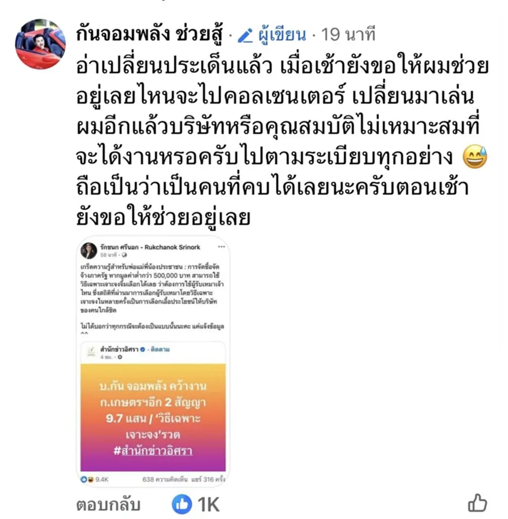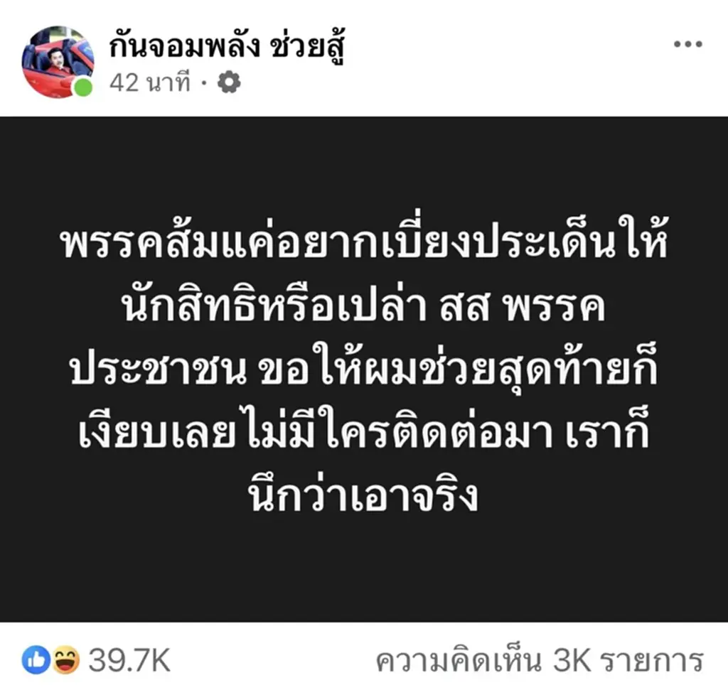 เมื่อวันที่ 15 ตุลาคม 2568 เพจ “กัน จอมพลัง” ได้โพสต์เผยความคืบหน้ากรณีดังกล่าว โดยระบุว่า “พรรคส้มแค่อยากเบี่ยงประเด็นให้นักสิทธิหรือเปล่า ส.ส.พรรคประชาชน ขอให้ผมช่วย สุดท้ายก็เงียบเลยไม่มีใครติดต่อมา เราก็นึกว่าเอาจริง