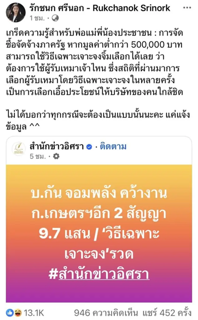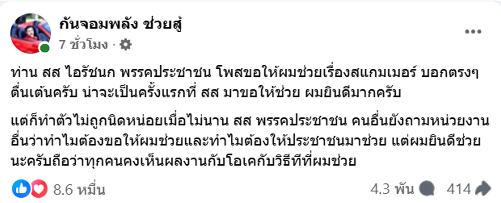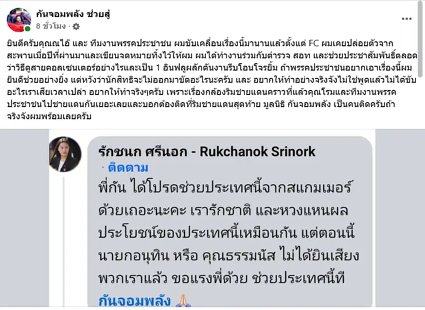 จากกรณี “กัน จอมพลัง” โพสต์ตอบรับ “ไอซ์ รักชนก” ส.ส.พรรคประชาชน หลังขอให้ช่วยปราบปรามแก๊งสแกมเมอร์ ยันพร้อมร่วมมือเต็มที่ หลังจาก ไอซ์ รักชนก ศรีนอก ส.ส.กทม. พรรคประชาชน แชร์โพสต์ นายรังสิมันต์ โรม ส.ส.บัญชีรายชื่อ พรรคประชาชน พร้อมวอน “กัน จอมพลัง” ได้โปรดช่วยประเทศนี้จากสแกมเมอร์ด้วย “นายกฯ อนุทิน-ธรรมนัส” ไม่ได้ยินเสียงเราแล้ว ตามที่นำเสนอข่าวไปแล้วนั้น