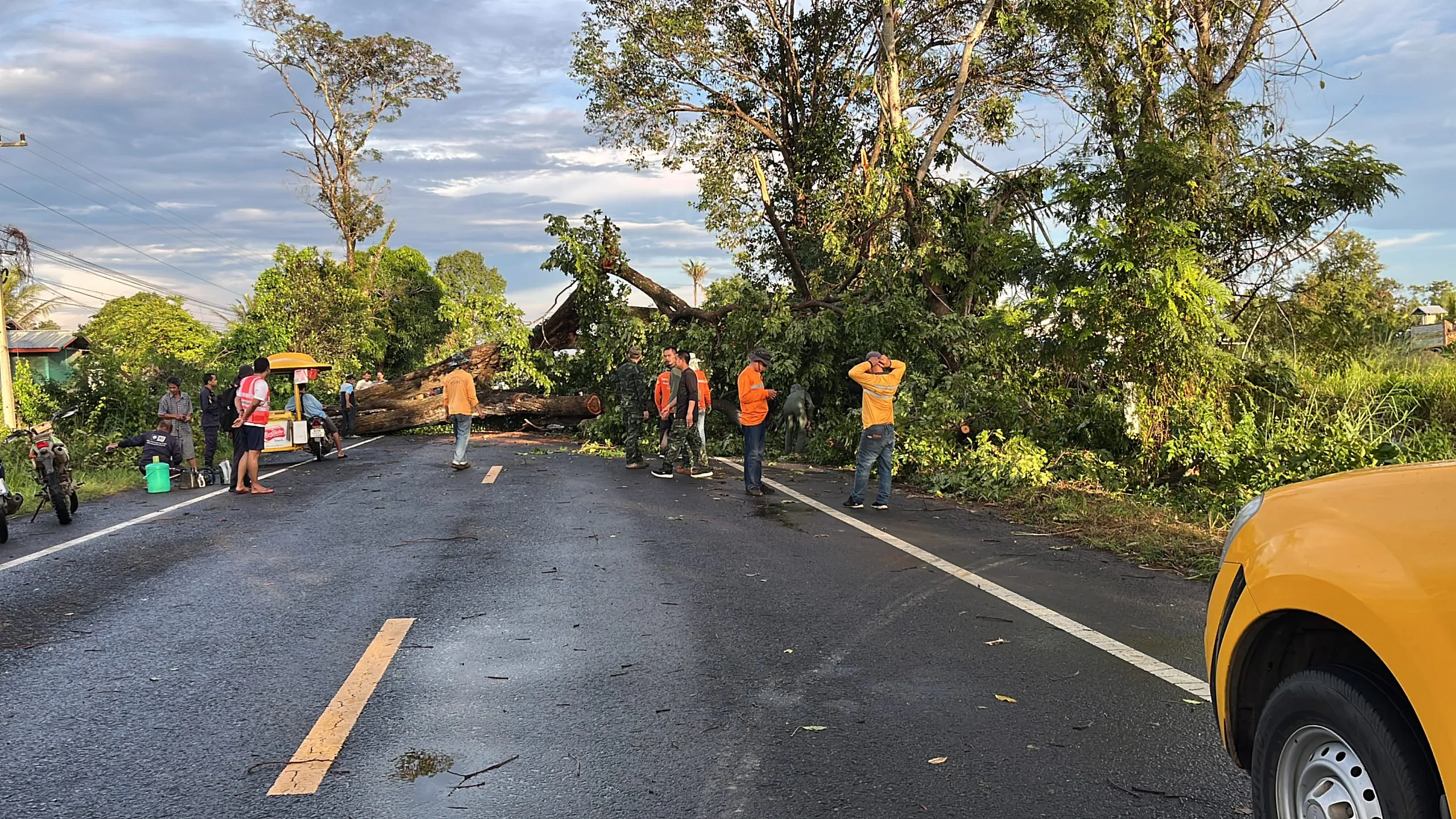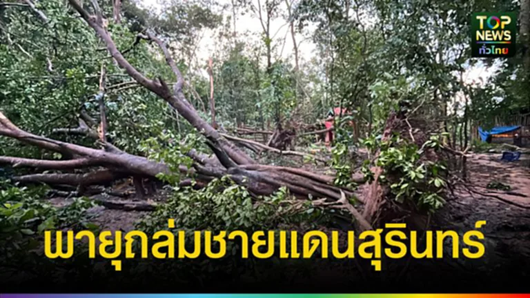 สุรินทร์-พายุฝนพัดถล่มชายแดน ต้นไม้ใหญ่ล้มระเนระนาด ทับบ้าน กุฏิพระ หลังคาปลิวหลายสิบหลัง จนท. เร่งช่วยเหลือและสำรวจความเสียหาย