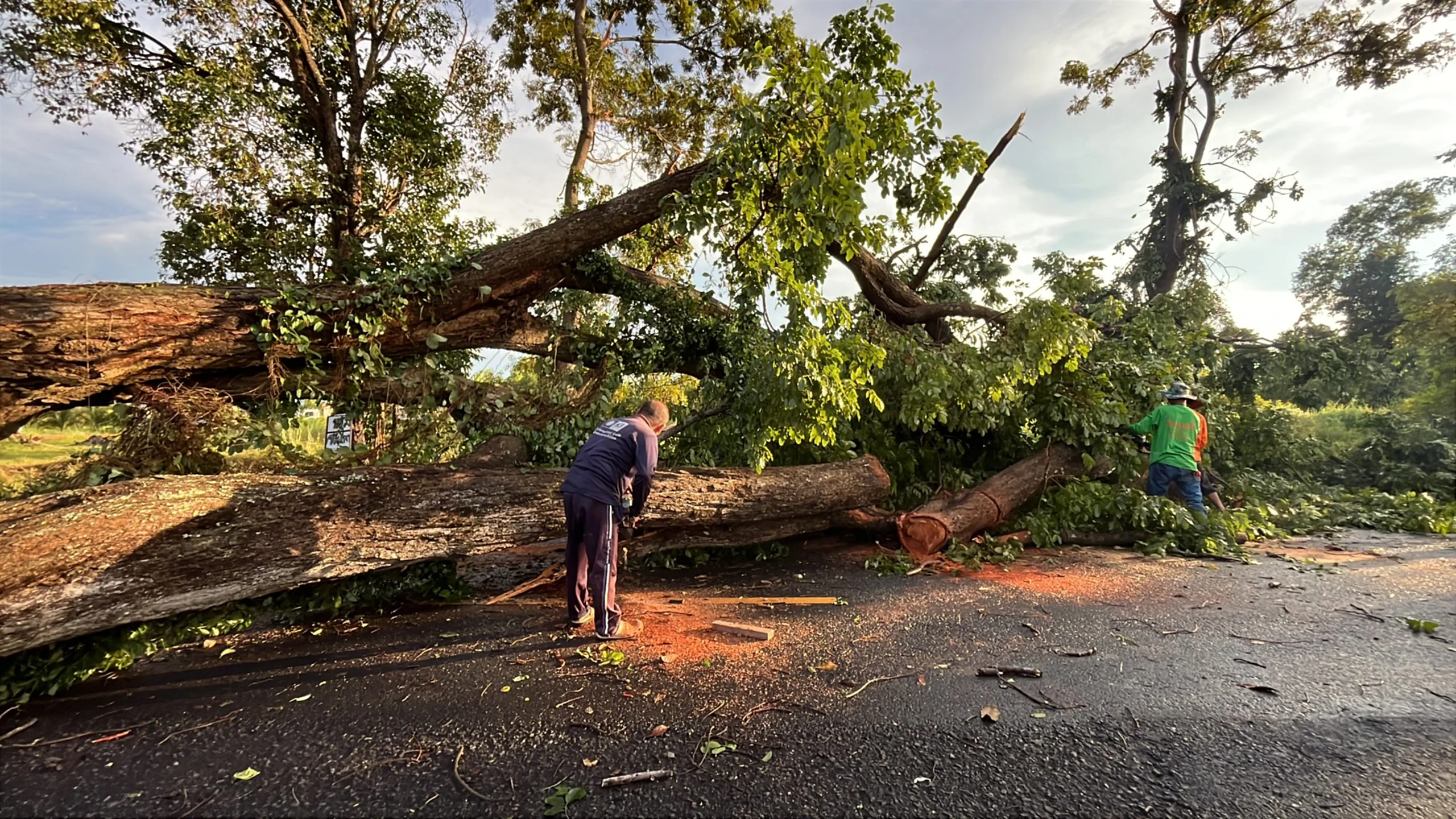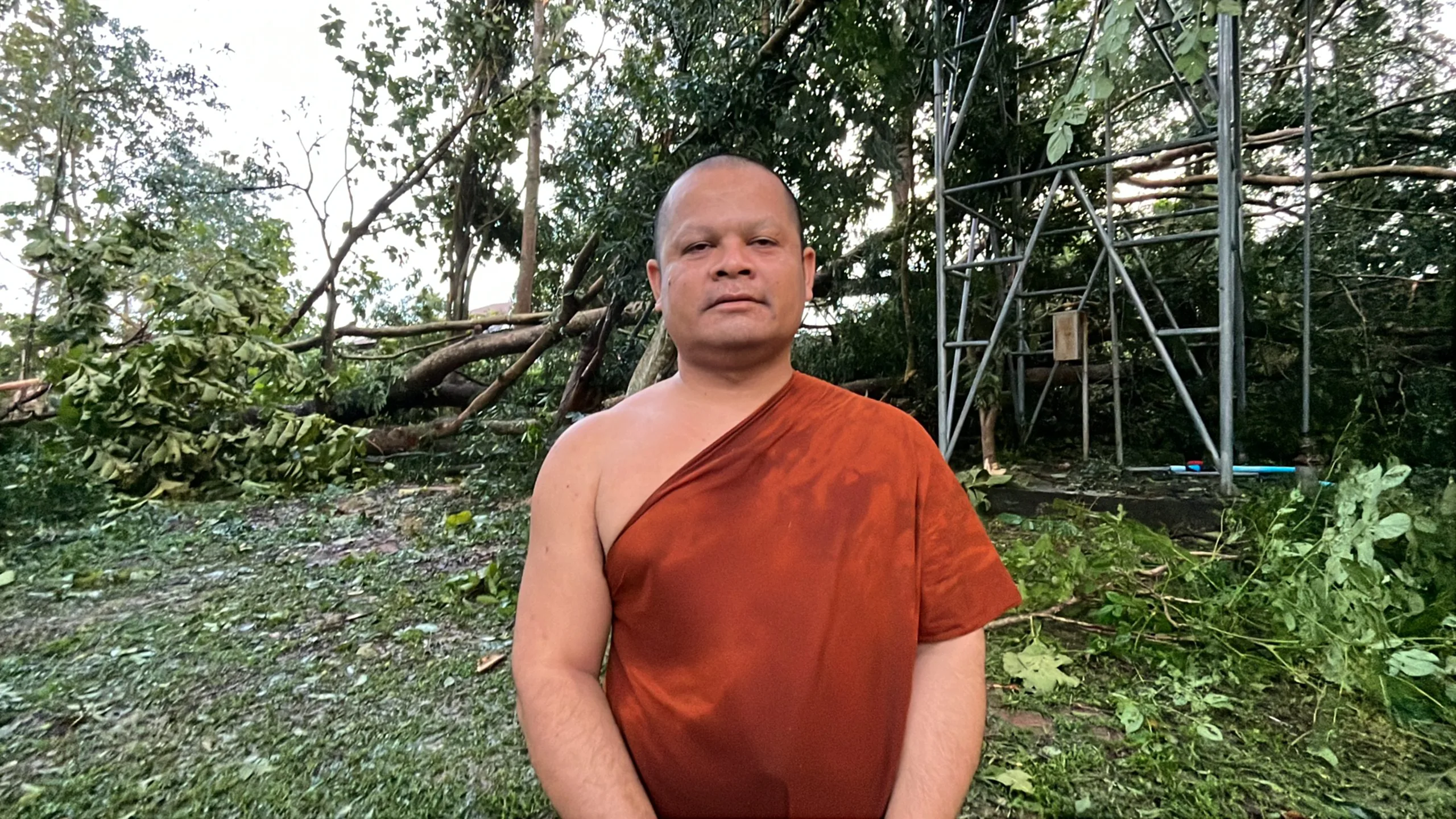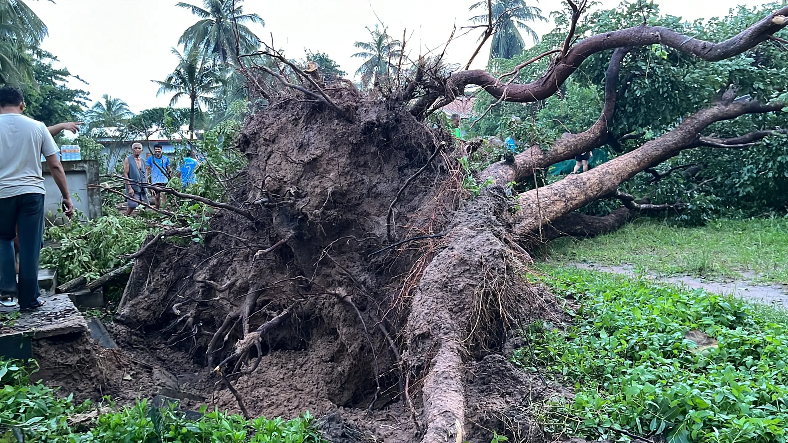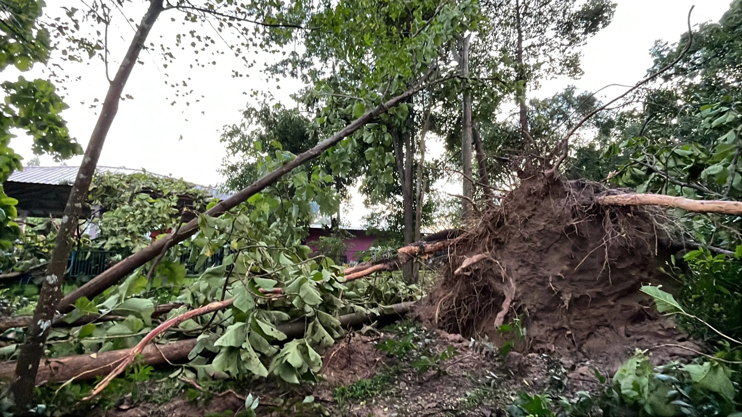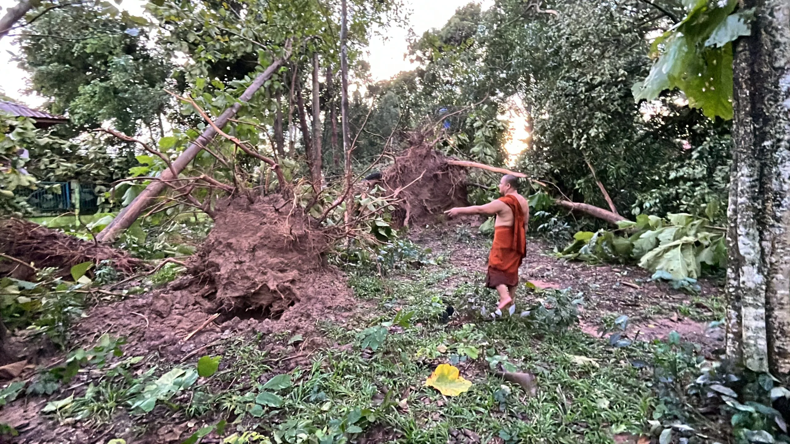 พายุฝนพัดถล่มชายแดน ต้นไม้ใหญ่ล้มระเนระนาด ทับบ้าน กุฏิพระ หลังคาปลิวหลายสิบหลัง จนท. เร่งช่วยเหลือและสำรวจความเสียหาย