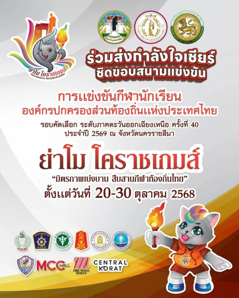 วันที่ 14 ตุลาคม 2568 ที่ห้องประชุมรวงผึ้ง องค์การบริหารส่วนจังหวัด(อบจ.)นครราชสีมา ดร.ยลดา หวังศุภกิจโกศล นายก อบจ.นครราชสีมา เป็นประธานการประชุมเตรียมความพร้อมการจัดแข่งขันกีฬานักเรียนองค์กรปกครองส่วนท้องถิ่นแห่งประเทศไทย รอบคัดเลือก ระดับภาคตะวันออกเฉียงเหนือ ครั้งที่ 40 “ย่าโม โคราชเกมส์” ที่จะมีขึ้นระหว่างวันที่ 20 – 30 ตุลาคมนี้ โดยจะมีพิธีเปิดการแข่งขันอย่างเป็นทางการในวันอังคารที่ 21 ตุลาคม 2568 ซึ่งจะมีทัพนักกีฬา ผู้ฝึกสอน และผู้เกี่ยวข้อง จาก 20 จังหวัด ภาคตะวันออกเฉียงเหนือ เข้าร่วมทำการแข่งขัน โดยมี คณะผู้บริหาร หัวหน้าส่วนราชการ และผู้เกี่ยวข้องเข้าร่วมประชุม