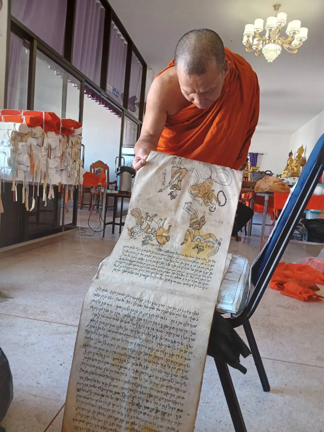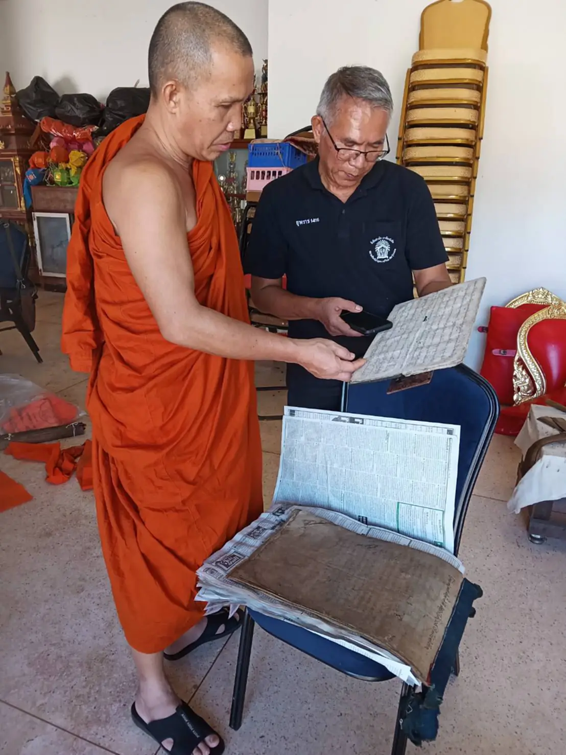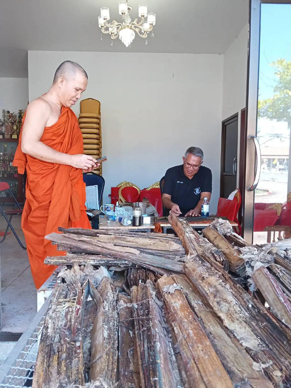 โดยวันนี้ (15 ตุลาคม 2568) สภาพของคัมภีร์หลายผูกถูกเชื้อราเกาะกินอย่างรุนแรง มากกว่าวัดก่อน ๆ ที่ผ่านมา จึงอาจต้องใช้วิธี “นึ่งด้วยไอน้ำ” แล้ว “แช่น้ำผสมแอลกอฮอล์ 75%” เพื่อหวังจะกู้ชีพให้คืนสภาพได้มากที่สุด