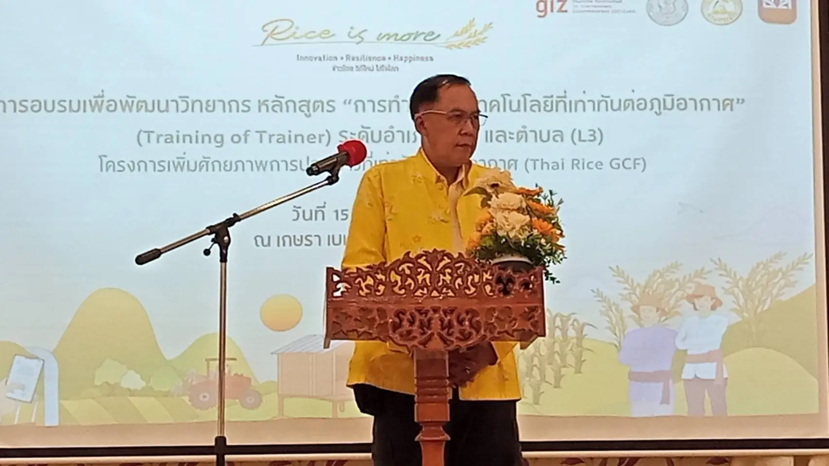 การอบรมครั้งนี้จัดขึ้นภายใต้โครงการเพิ่มศักยภาพการปลูกข้าวที่เท่าทันต่อภูมิอากาศ (Thai Rice GCF Project) ซึ่งเป็นความร่วมมือระหว่าง กรมส่งเสริมการเกษตร กรมการข้าว ธนาคารเพื่อการเกษตรและสหกรณ์การเกษตร (ธ.ก.ส.) และ องค์กรความร่วมมือระหว่างประเทศของเยอรมัน (GIZ) ได้รับทุนสนับสนุนจาก กองทุนภูมิอากาศสีเขียว (Green Climate Fund : GCF) มีวัตถุประสงค์เพื่อเตรียมความพร้อมบุคลากรด้านการเกษตรให้สามารถรับมือกับผลกระทบจากการเปลี่ยนแปลงสภาพภูมิอากาศ โดยใช้เทคโนโลยีและนวัตกรรมสมัยใหม่ในกระบวนการผลิตข้าวอย่างเหมาะสม