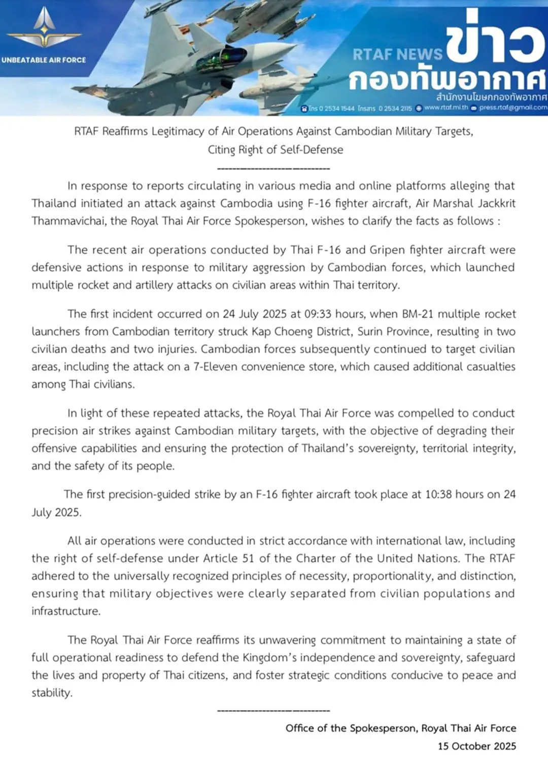 วันนี้ (15 ตุลาคม) พลอากาศโทจักรกฤษณ์ ธรรมวิชัย โฆษกกองทัพอากาศ เปิดเผยว่า ตามที่มีข่าวในสื่อมวลชนและสื่อสังคมออนไลน์ว่า ในสถานการณ์ความขัดแย้งบริเวณชายแดนระหว่างไทยและกัมพูชา ไทยเป็นฝ่ายเริ่มโจมตีกัมพูชาก่อนโดยการใช้เครื่องบินขับไล่แบบ F-16 นั้น กองทัพอากาศขอชี้แจงข้อเท็จจริง ดังนี้