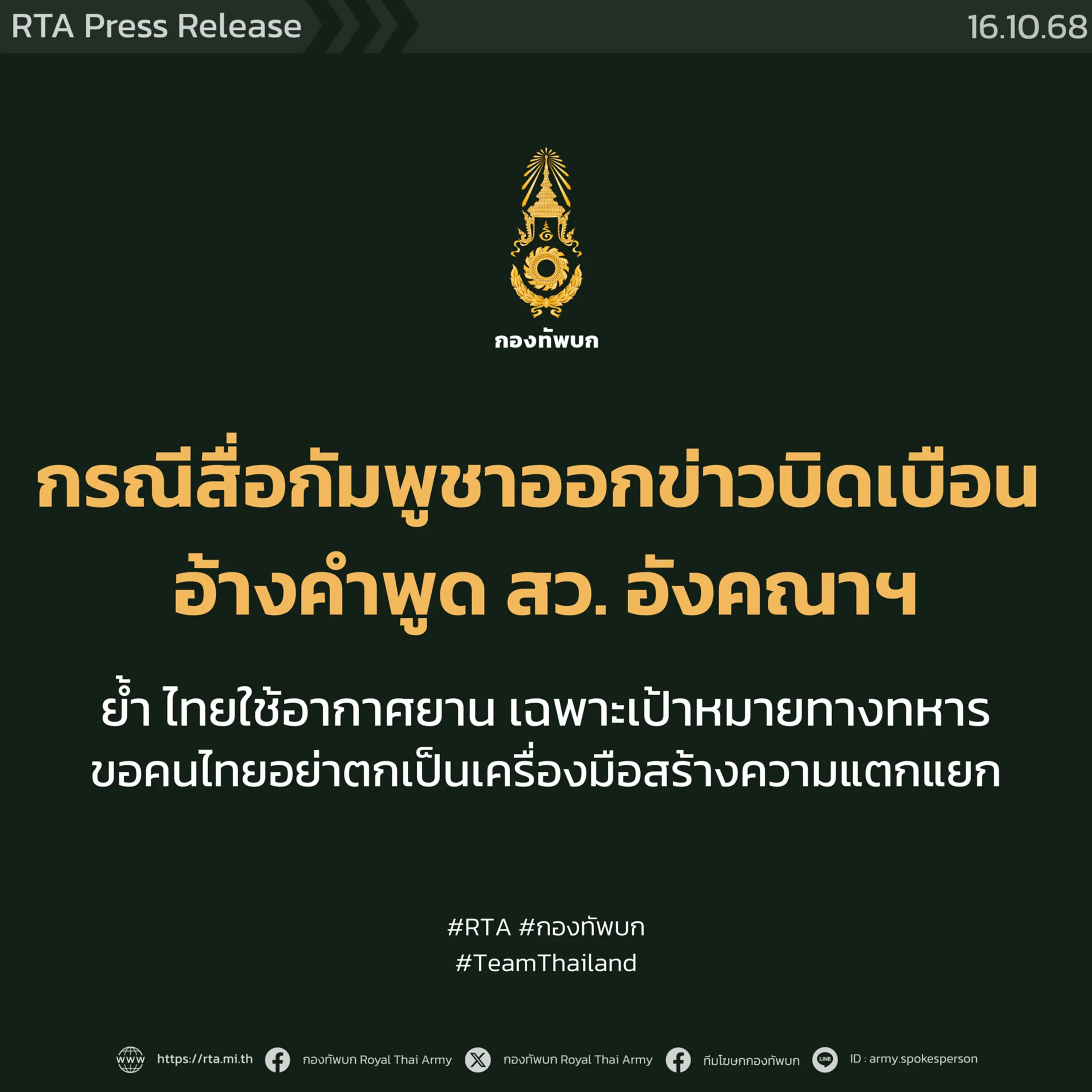 จากกรณีที่สื่อกัมพูชานำเสนอข่าวโดยระบุว่า นางอังคณา นีละไพจิตร สมาชิกวุฒิสภาไทย “ออกมายอมรับกับสื่อว่าไทยใช้เครื่องบินขับไล่ F-16 ทิ้งระเบิด MK-84 โจมตีกัมพูชาก่อน” ซึ่งเมื่อตรวจสอบพบว่า เป็นการนำคำพูดของนางอังคณาฯ ที่กล่าวว่า “การใช้ F-16 ของไทยโจมตีกัมพูชาก็ทำให้กัมพูชาได้รับความสูญเสียไม่น้อย” มาบิดเบือนและสร้างเนื้อหาข่าวให้เกิดความเข้าใจผิดในสังคม