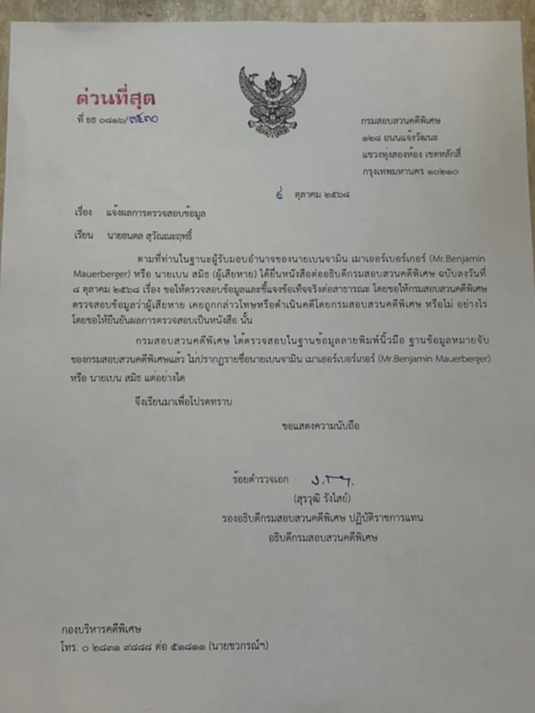Mauerberger) หรือ นายเบน สมิธ (ผู้เสียหาย) ได้ยื่นหนังสือต่ออธิบดีกรมสอบสวนคดีพิเศษ ฉบับลงวันที่ 8 ตุลาคม 2568 เรื่อง ขอให้ตรวจสอบข้อมูลและชี้แจงข้อเท็จจริงต่อสาธารณะ