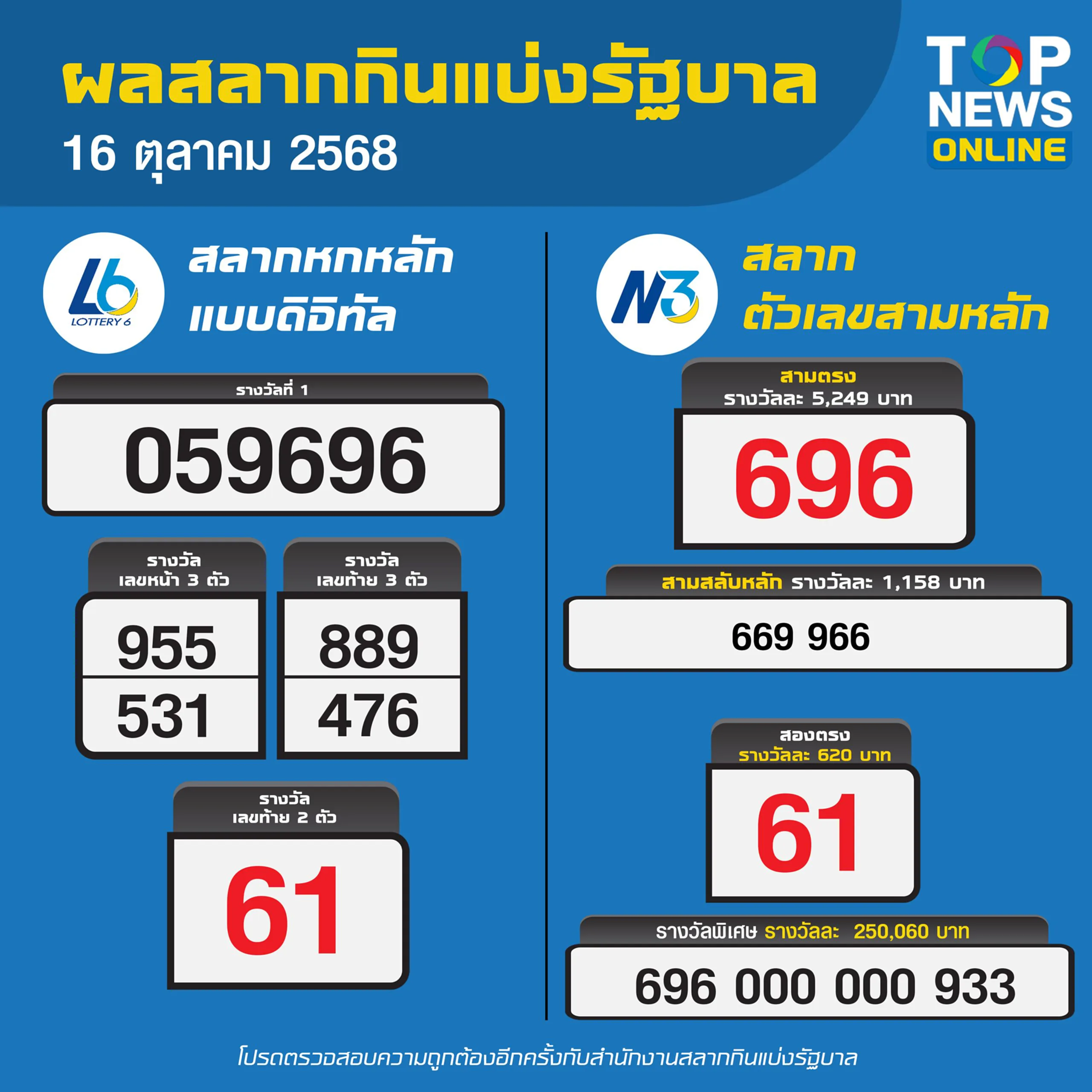 ตรวจหวย ผลสลากกินแบ่งรัฐบาล งวดประจำวันที่ 16 ตุลาคม 2568 – Top News รายงาน