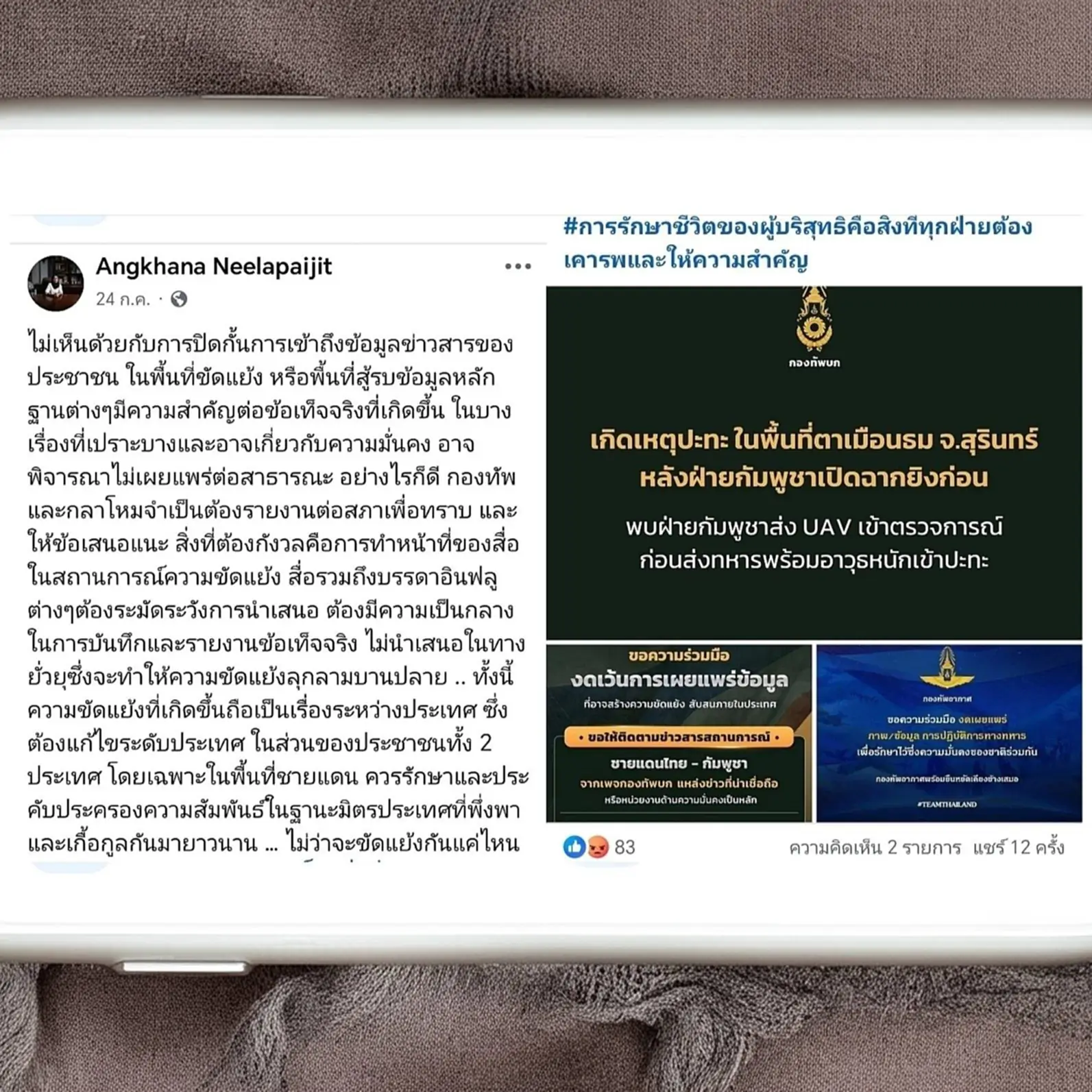 ในช่วงเวลาใกล้เคียงนั้น ท่านโพสต์ตำหนิกองทัพ ที่โพสต์ขอความร่วมมือประชาชนคนไทยไม่ให้โพสต์ภาพข้อมูลการเคลื่อนไหวของทหารไทยบริเวณชายแดน เพื่อให้ปฏิบัติการมีประสิทธิภาพ แต่ท่าน สว. ก็ว่าเป็นการปิดกั้นข้อมูลข่าวสาร