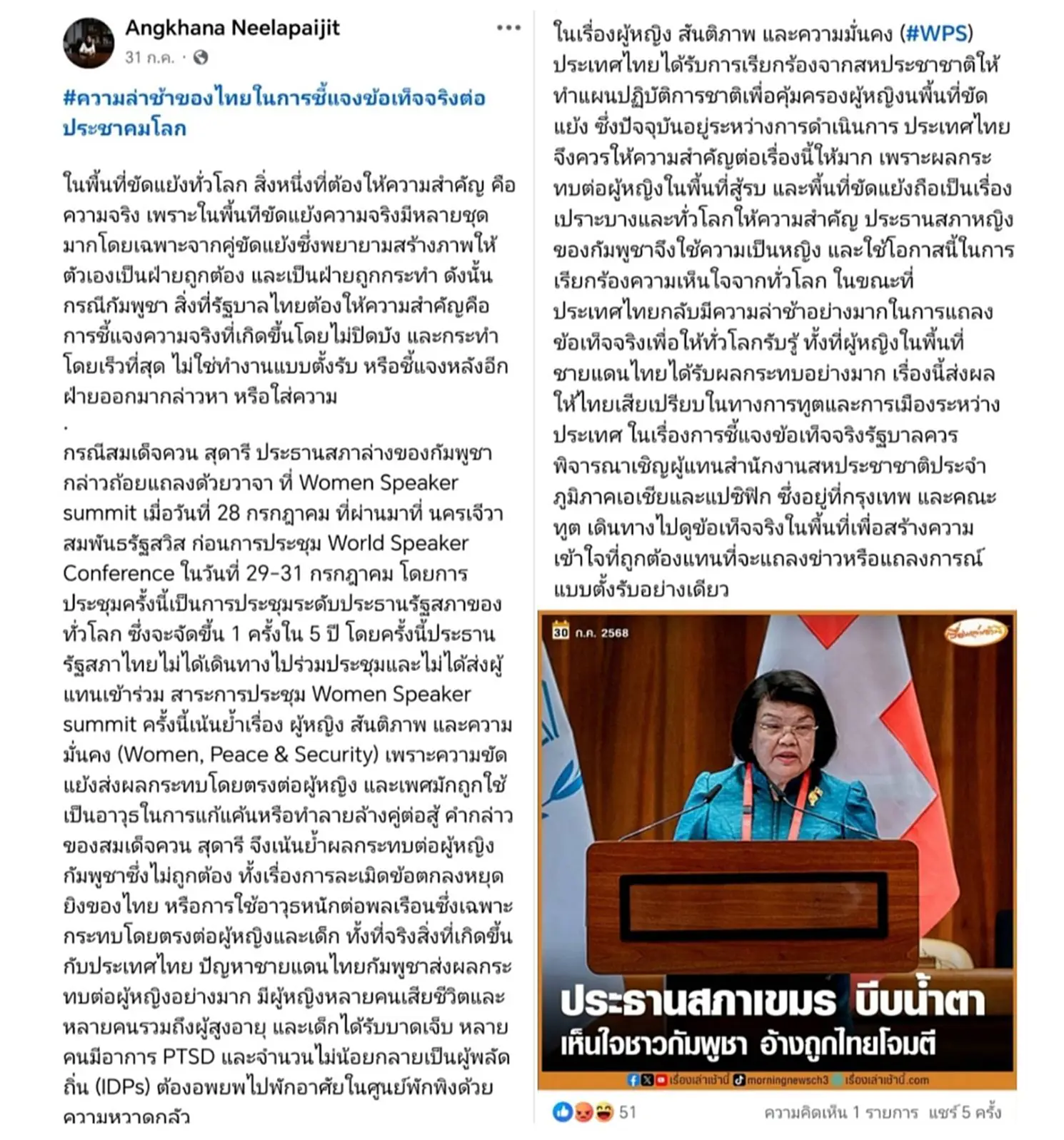 ในวันที่ 31 กรกฏาคม 2568 ท่านโพสต์ตำหนิ ทางการไทยที่ชี้แจงประชาคมโลกช้า