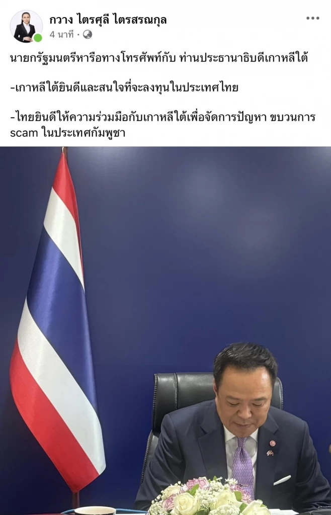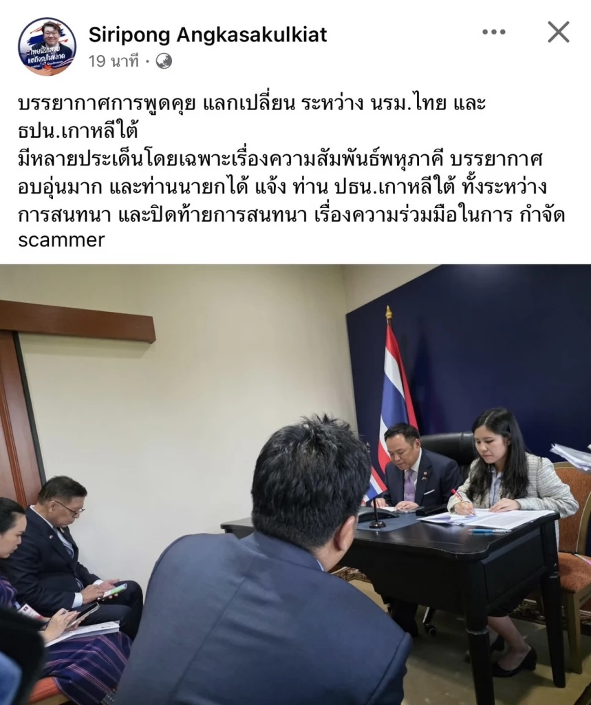 โดยระบุข้อความว่า ประเทศเกาหลีใต้ยินดี และสนใจที่จะลงทุนในประเทศไทย ขณะเดียวกันประเทศไทยยินดีให้ความร่วมมือกับเกาหลีใต้ เพื่อจัดการปัญหาขบวนการสแกมเมอร์ในประเทศกัมพูชาด้วย
