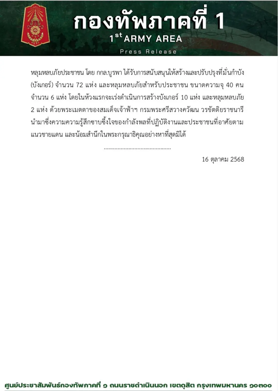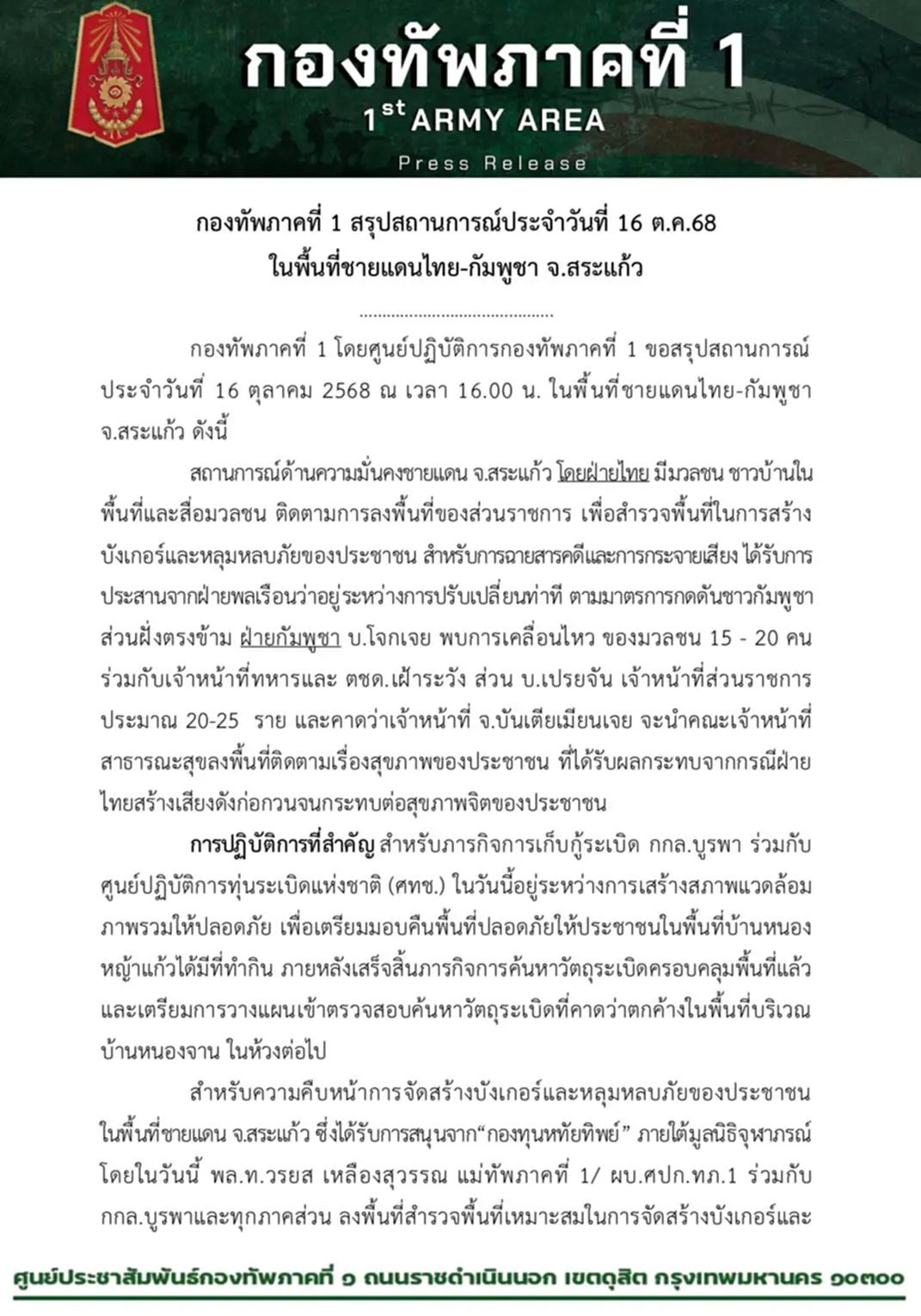 เมื่อวันที่ 16 ตุลาคม 2568 เวลา 16.00 น. กองทัพภาคที่ 1 โดยศูนย์ปฏิบัติการกองทัพภาคที่ 1 สรุปภาพรวมสถานการณ์ในพื้นที่ชายแดนไทย-กัมพูชา จังหวัดสระแก้วว่า ฝ่ายไทย มีมวลชน ชาวบ้านในพื้นที่และสื่อมวลชน ติดตามการลงพื้นที่ของส่วนราชการ เพื่อสำรวจพื้นที่ในการสร้างบังเกอร์และหลุมหลบภัยของประชาชน