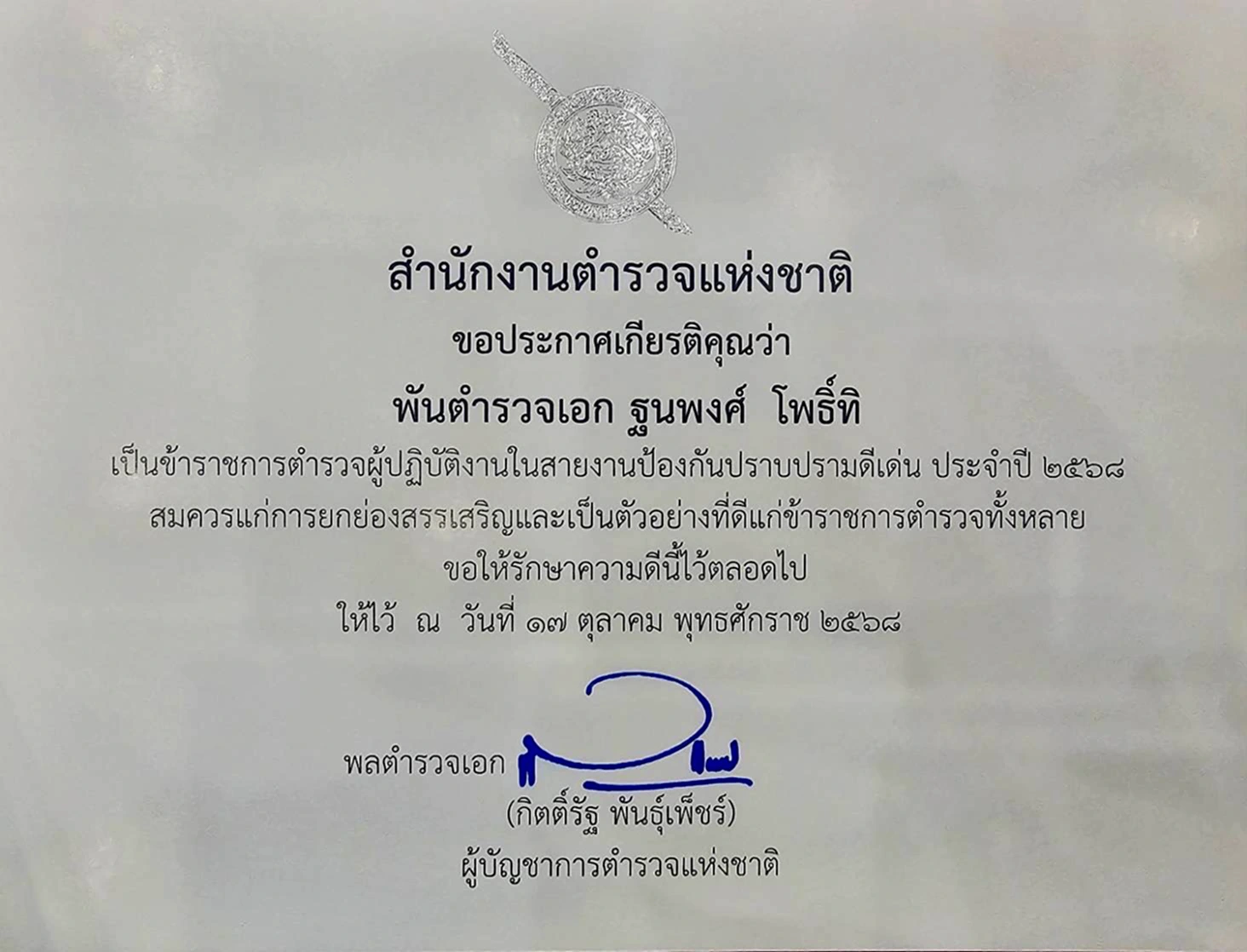 จากนั้น ผบ.ตร. เป็นประธานพิธีมอบโล่ประกาศเกียรติคุณให้แก่ผู้ให้การสนับสนุนช่วยเหลืองานสำนักงานตำรวจแห่งชาติ, ข้าราชการตำรวจที่ประพฤติปฏิบัติดีเยี่ยมตามประมวลจริยธรรม, ข้าราชการตำรวจและหน่วยงานในสังกัดสำนักงานตำรวจแห่งชาติที่ได้ผ่านการคัดเลือกดีเด่นในด้านต่างๆ และพลเมืองดีที่ช่วยเหลืองานตำรวจ รวมจำนวน 128 รายโดย พล.ต.อ.กิตติ์รัฐ พันธุ์เพ็ชร ผบ.ตร. ได้มอบประกาศใบเกียรติคุณ งานป้องกันปราบปรามดีเด่นประจำปี 2568 ให้ “ผกก.เต๋า”พ.ต.อ.ฐนพงศ์ โพธิ์ทิ ผกก.สภ.เสม็ด