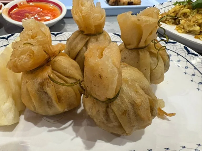 - ถุงทอง ของว่างเรียกน้ำย่อยชั้นดี แป้งกรอบบางห่อไส้หมูปรุงรสแน่นเต็มคำ ทอดใหม่ร้อน ๆ เสิร์ฟพร้อมน้ำจิ้มบ๊วยกอ