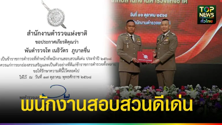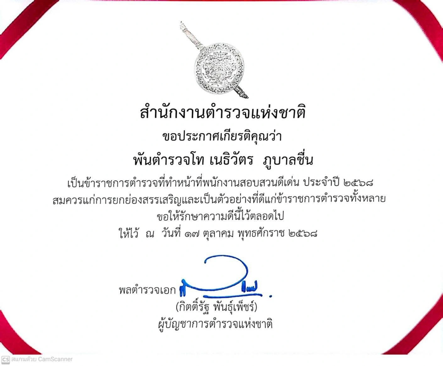 ในการนี้ พันตำรวจโท เนธิวัตร ภูบาลชื่น รองผู้กำกับการสอบสวนสถานีตำรวจภูธรสัตหีบ ได้รับประกาศเกียรติคุณ “พนักงานสอบสวนดีเด่น ประจำปี 2568”