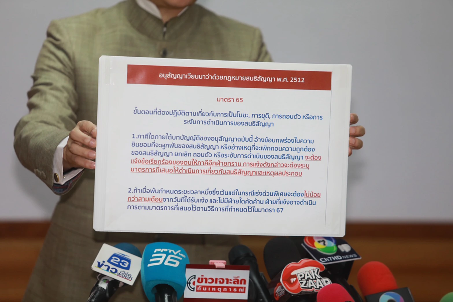อาจารย์ปานเทพยังให้คำแนะนำอีกว่า ขอให้รัฐบาลไทยยกเลิก MOU 43 โดยใช้มาตรา 60 ตามกฎหมายอนุสัญญากรุงเวียนนา ว่าด้วยกฎหมายสนธิสัญญาปี พ.ศ 2512 เนื่องจากกัมพูชามีการละเมิดร้ายแรง ไม่ว่าจะเป็นทั้งวางทุ่นระเบิดตามแนวชายแดน หรือยิงใส่พลเรือน ซึ่งตอนนี้กัมพูชาทำทั้ง 2 อย่างไปแล้ว ก็จะเข้าสู่มาตรา 45 ที่สามารถฉีก MOU 43 ได้ทันที