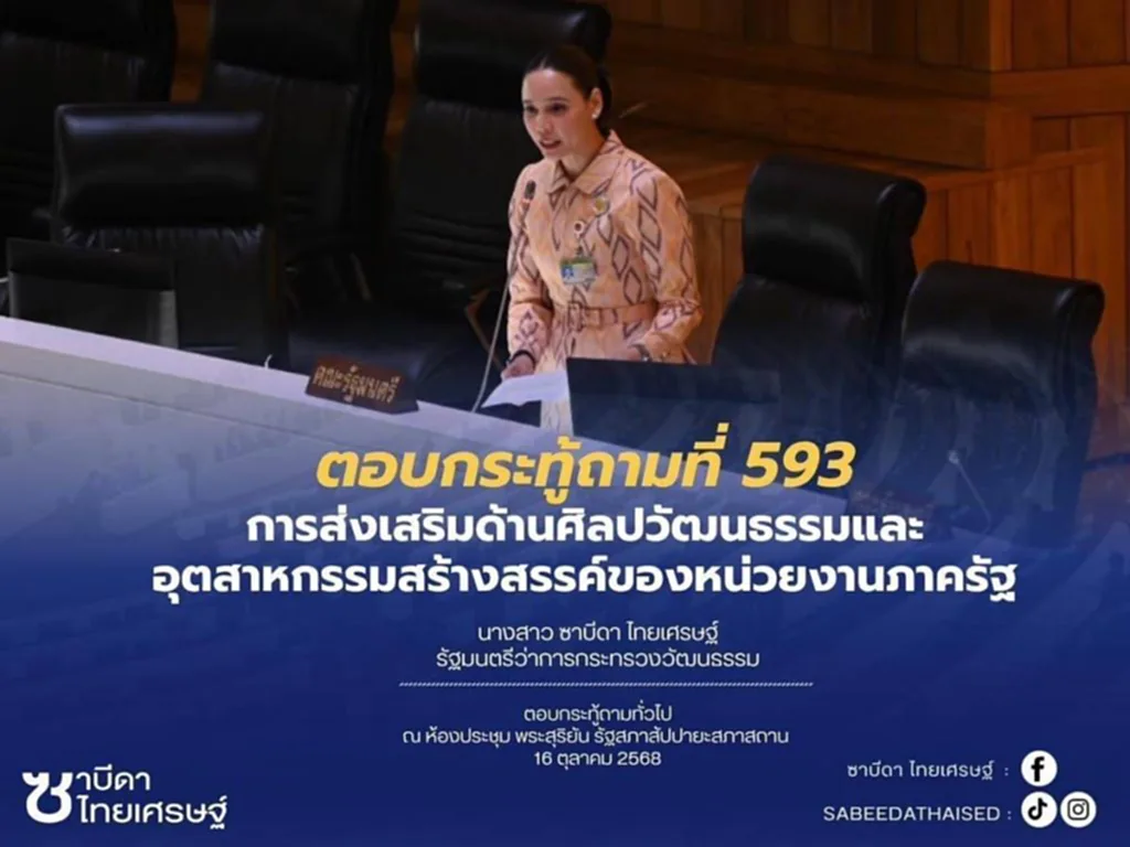 เมื่อวันที่ 16 ต.ค. 2568 ที่ผ่านมา ในการประชุมสภาผู้แทนราษฎร นางสาวซาบีดา ไทยเศรษฐ์ รัฐมนตรีว่าการกระทรวงวัฒนธรรม ตอบกระทู้ถามทั่วไปนายอภิสิทธิ์ ไล่สัตรูไกล สส.บัญชีรายชื่อ พรรคประชาชน เกี่ยวกับการบริหารงบประมาณ ว่า รัฐมนตรีเพิ่งเข้ารับตำแหน่งได้ประมาณ 2 สัปดาห์ และได้พยายามรีวิวโครงการต่างๆ เพื่อทบทวนและชะลอหลายโครงการที่ไม่มีประสิทธิภาพ โดยจะดูจากผลสัมฤทธิ์ เมื่อเทียบกับปีที่แล้ว ซึ่งจะต้องมีการปรับเปลี่ยนให้เข้ากับนโยบายปัจจุบัน โดยนโยบาย 3 ประการคือ 1.ส่งเสริม การท่องเที่ยวทางวัฒนธรรม 2.คืนเงินทุนให้กับผู้ประกอบการภาพยนตร์ชาวไทย 3.พัฒนาสินค้าทางด้านวัฒนธรรม