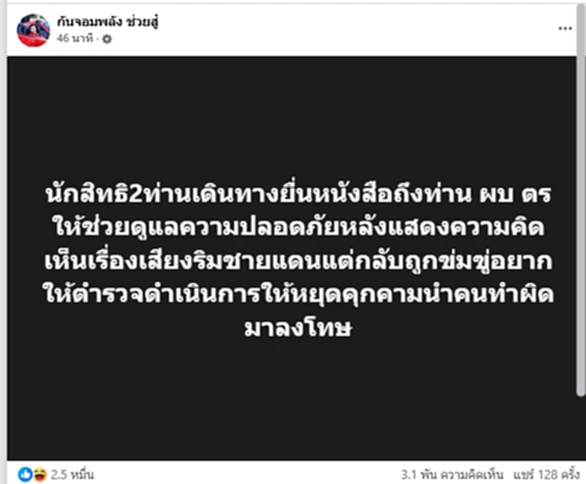 ล่าสุดกัน จอมพลังออกมาโพสตืข้อความตอบกลับทันทีว่า “นักสิทธิ2ท่านเดินทางยื่นหนังสือถึงท่าน ผบ ตร ให้ช่วยดูแลความปลอดภัยหลังแสดงความคิดเห็นเรื่องเสียงริมชายแดนแต่กลับถูกข่มขู่อยากให้ตำรวจดำเนินการให้หยุดคุกคามนำคนทำผิดมาลงโทษ”