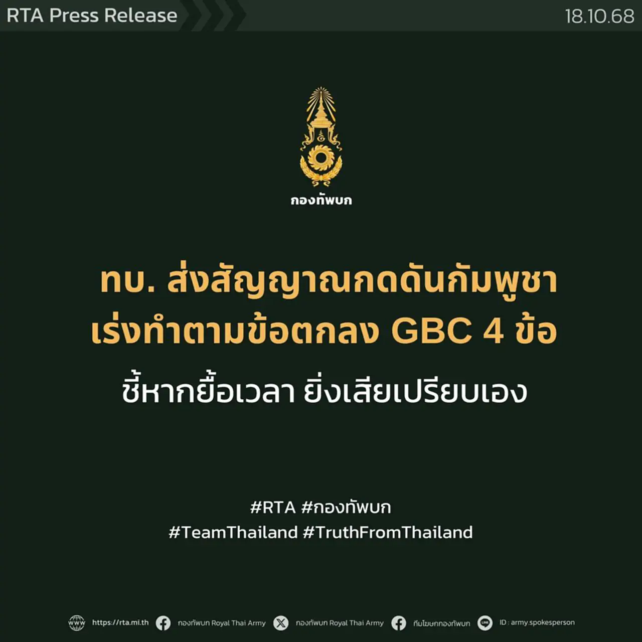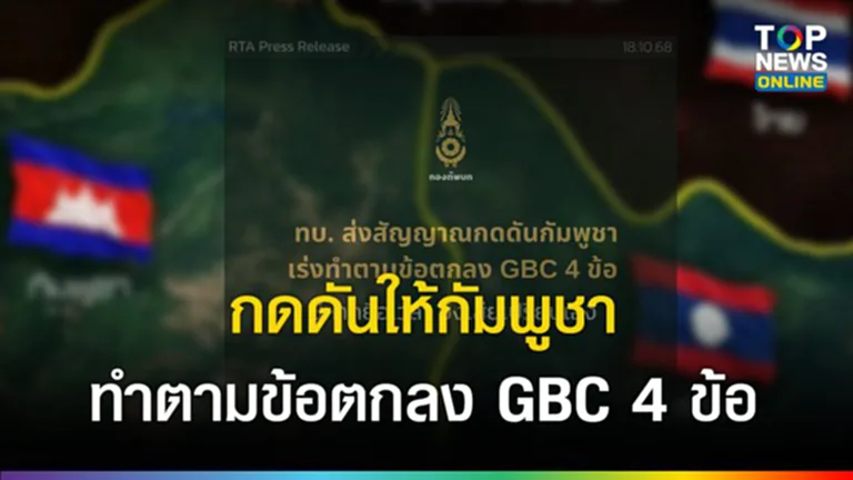 "ทบ." ส่งสัญญาณชัด กดดันให้กัมพูชาทำตามข้อตกลง GBC 4 ข้อ ชี้ยื้อเวลายิ่งเสียเปรียบเอง