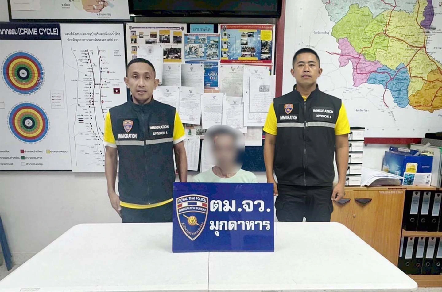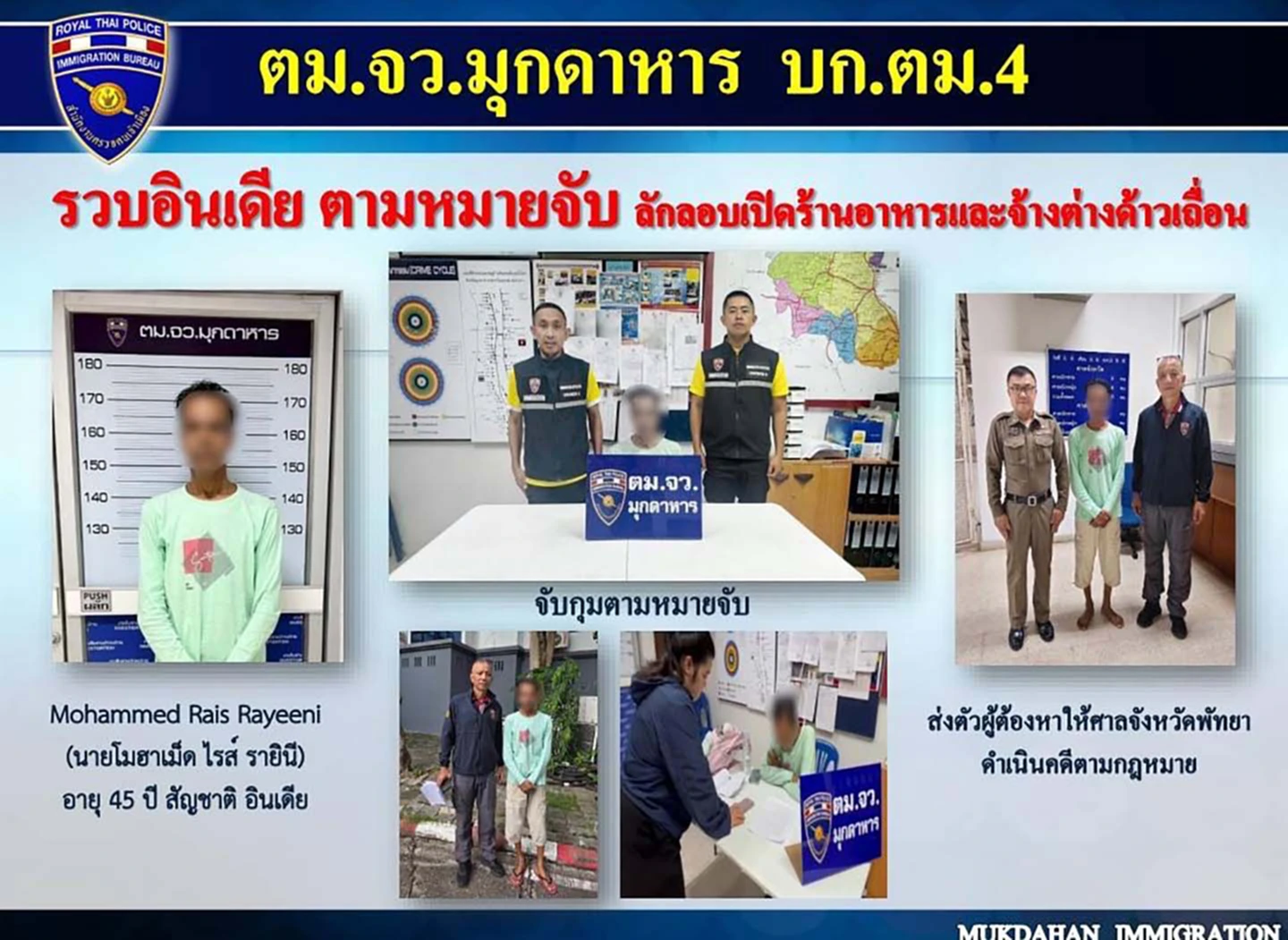 โดยเจ้าหน้าที่ชุดสืบสวนฯ ร่วมกับ งานตรวจบุคคลและพาหนะ ตม.จว.มุกดาหาร ได้ทำการจับกุมหนุ่มชาวอินเดีย กล่าวคือ เมื่อวันที่ 17  ตุลาคม 2568 เวลาประมาณ 10.00 น. นายโมฮาเม็ด ไรส์ รายินี (Mr.Mohammed Rais Rayeeni) ได้มายื่นหนังสือเดินทางให้เจ้าหน้าที่ตรวจเพื่อประสงค์จะเดินทางออกนอกราชอาณาจักร ณ จุดผ่านแดนถาวรสะพานมิตรภาพไทย-ลาว แห่งที่ 2 (มุกดาหาร-สะหวันนะเขต) เมื่อเจ้าหน้าที่งานตรวจบุคคลและพาหนะ ตม.จว.มุกดาหาร ได้ทำการตรวจสอบข้อมูลในระบบสารสนเทศตรวจคนเข้าเมือง (BIOMETRIC) พบว่าเป็นบุคคลต้องห้ามเดินทางเข้าออกราชอาณาจักร จึงได้แจ้งประสานชุดสืบสวนฯ ตม.จว.มุกดาหาร มาตรวจสอบเพื่อดำเนินการเช็คข้อมูลในระบบ CRIMES ผลปรากฏว่า นายโมฮาเม็ด ไรส์ รายินี (Mr.Mohammed Rais Rayeeni) อายุ 45 ปี สัญชาติ อินเดีย ถือหนังสือเดินทางเลขที่ Z8150800 แจ้งที่อยู่ 27/19 หมู่ที่ 10 ต.หนองปรือ อ.บางละมุง จ.ชลบุรี มีหมายจับศาลจังหวัดพัทยา ที่ 712/2568 ลง 16 ตุลาคม 2568 กระทำความผิดฐาน “ร่วมกันรับคนต่างด้าวทำงานโดยที่คนต่างด้าวไม่มีใบอนุญาตทำงานหรือ   ให้คนต่างด้าวทำงานนอกเหนือจากสิทธิที่จะทำได้ และร่วมกันขายสุราโดยไม่ได้รับอนุญาต”