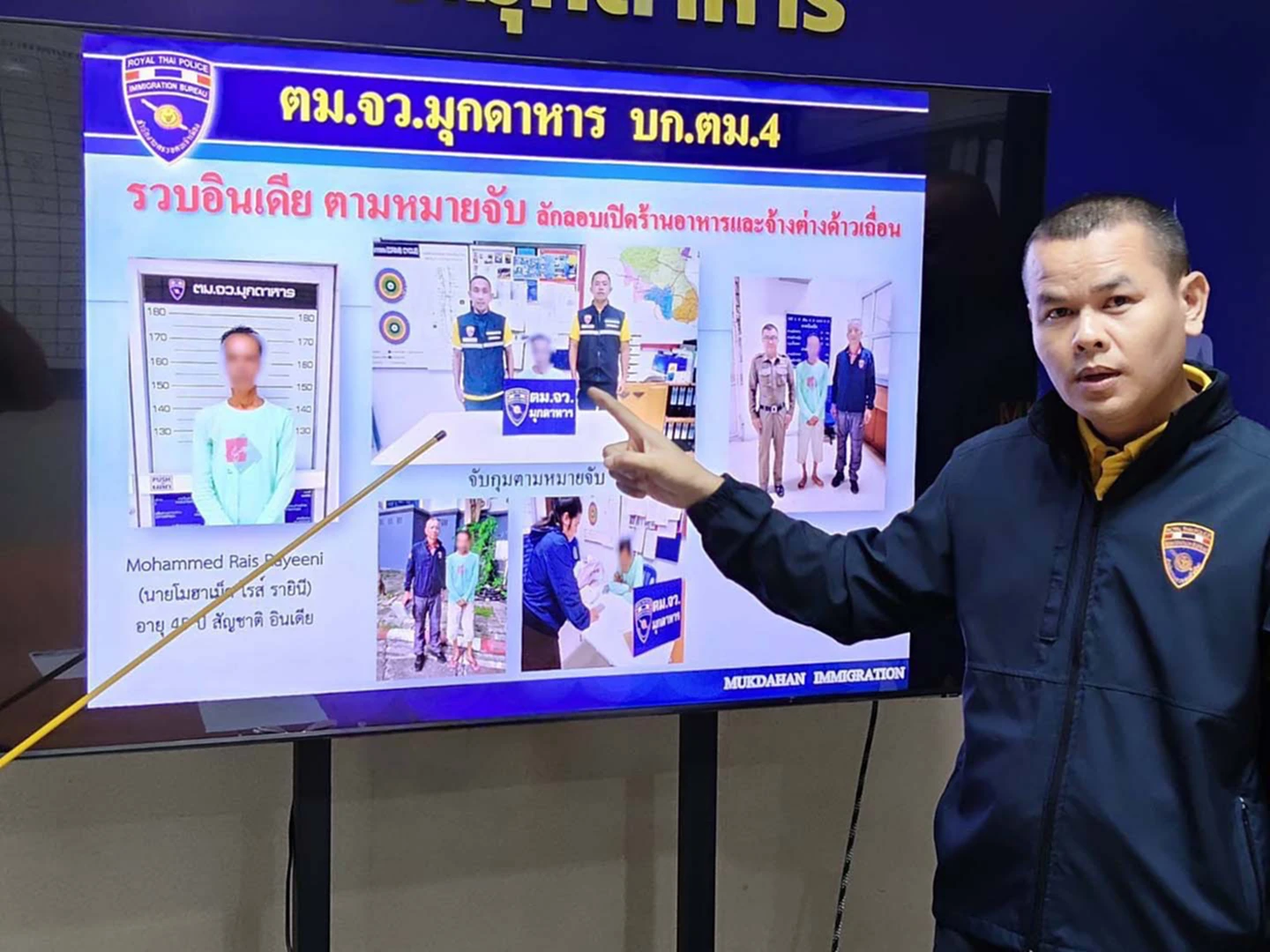 ตรวจคนเข้าเมืองจังหวัดมุกดาหาร แถลงข่าวรวบหนุ่มอินเดียตามหมายจับ ลักลอบเปิดร้านอาหาร และจ้างแรงงานเถื่อน