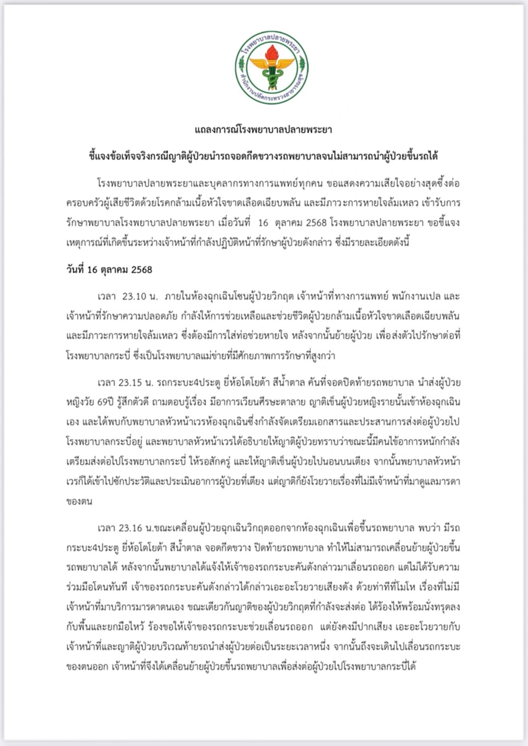 ก่อนหน้านั้นแถลงการณ์โรงพยาบาลปลายพระยา ชี้แจงข้อเท็จจริงกรณีญาติผู้ป่วยนำรถจอดกีดขวางรถพยาบาลจนไม่สามารถนำผู้ป่วยขึ้นรถได้ โรงพยาบาลปลายพระยาและบุคลากรทางการแพทย์ทุกคน ขอแสดงความเสียใจอย่างสุดซึ้งต่อครอบครัวผู้เสียชีวิตด้วยโรคกล้ามเนื้อหัวใจขาดเลือดเฉียบพลัน และมีภาวะการหายใจล้มเหลว เข้ารับการรักษาพยาบาลโรงพยาบาลปลายพระยา เมื่อวันที่ 16 ตุลาคม 2568 โรงพยาบาลปลายพระยา ขอชี้แจงเหตุการณ์ที่เกิดขึ้นระหว่างเจ้าหน้าที่กำลังปฏิบัติหน้าที่รักษาผู้ป่วยดังกล่าว